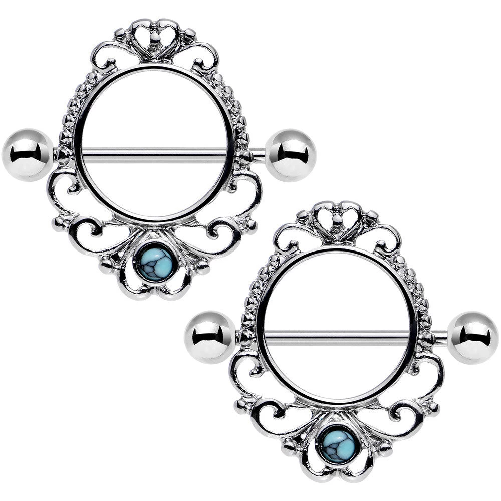 Make sure that your breasts are dressed in their most ornate best whenever you wear this elegant nipple piercing set. Made with 19mm surgical grade stainless steel straight barbells, this 14 gauge nipple ring set features an ornate halo of swirling decorative shield set with a single faux turquoise for eye catching charm, a 13mm opening, and is sold as a set of two.