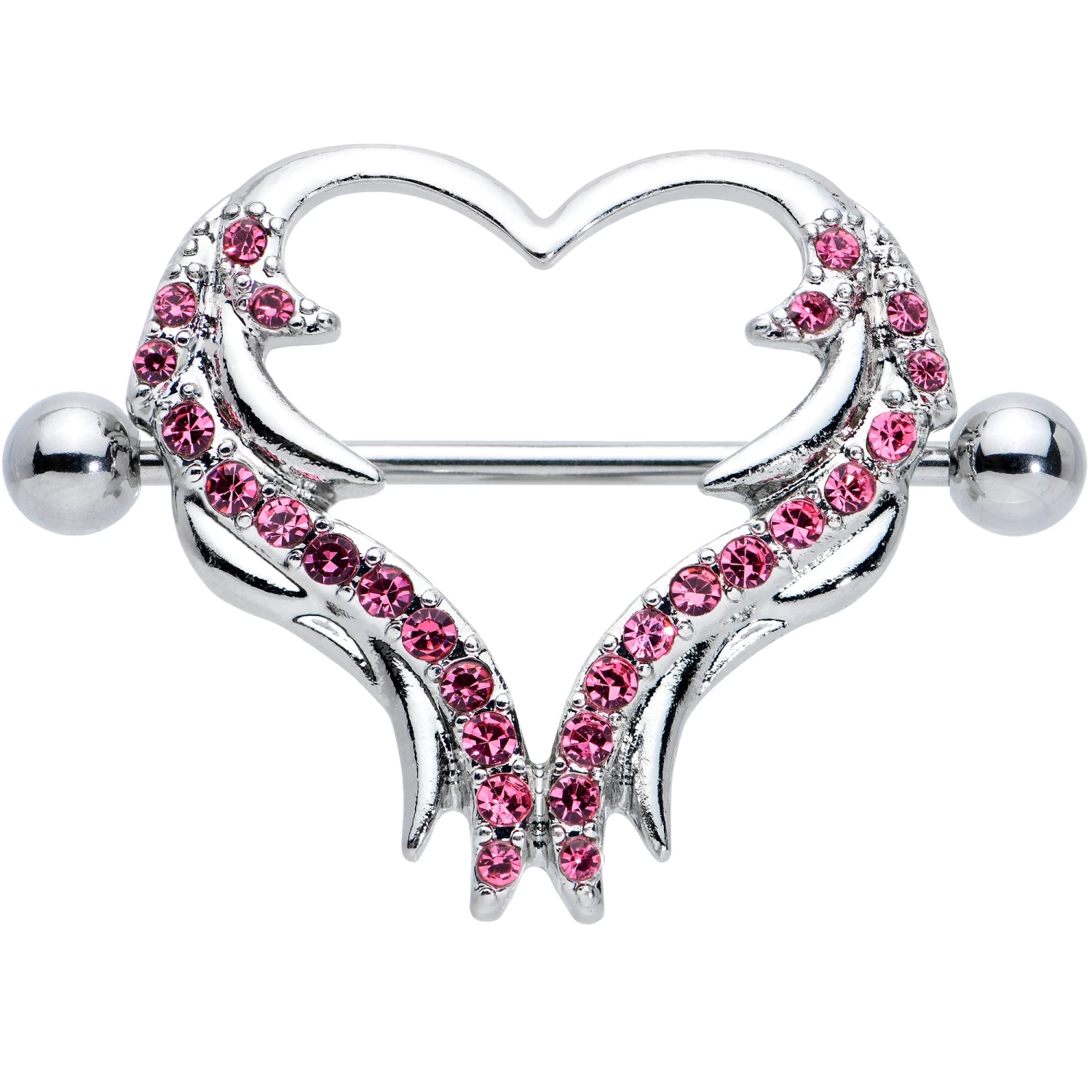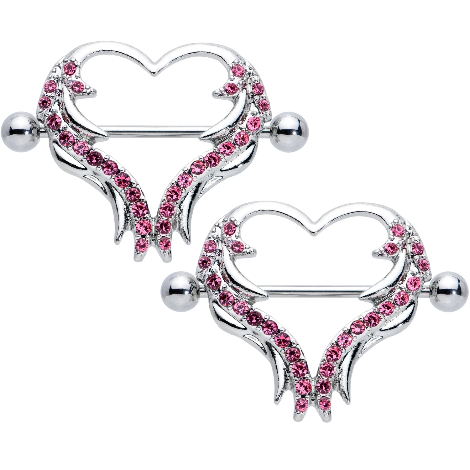 Give your heart to rock music with this 14 gauge nipple jewelry! It’s made with 19mm wearable length 316L surgical grade stainless steel straight barbells with 5mm ball ends. The shield portion features a heart charm, with wild, splashy lines that have an 80s retro feel. They’re embellished with pink gems for an added detail that gives a perfectly cohesive touch of glamour. If you love to rock and you’re ready to show, these retro nipple shields are sure to get you rolling! Sold as a set of two.