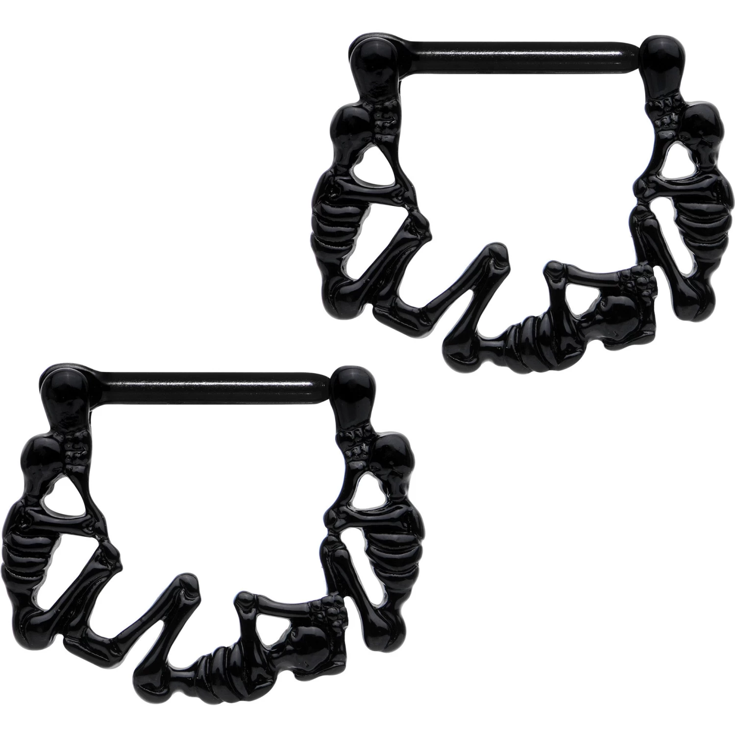 Watch out for the spooky skeleton parade! This 14 gauge nipple clicker set features skeletons parading from one side to the other of these 3/8″ hinged straight barbells made with black anodized over durable 316L surgical grade stainless steel. This pair of nipple piercings features a 7mm rise and is sold as a set of two for you!