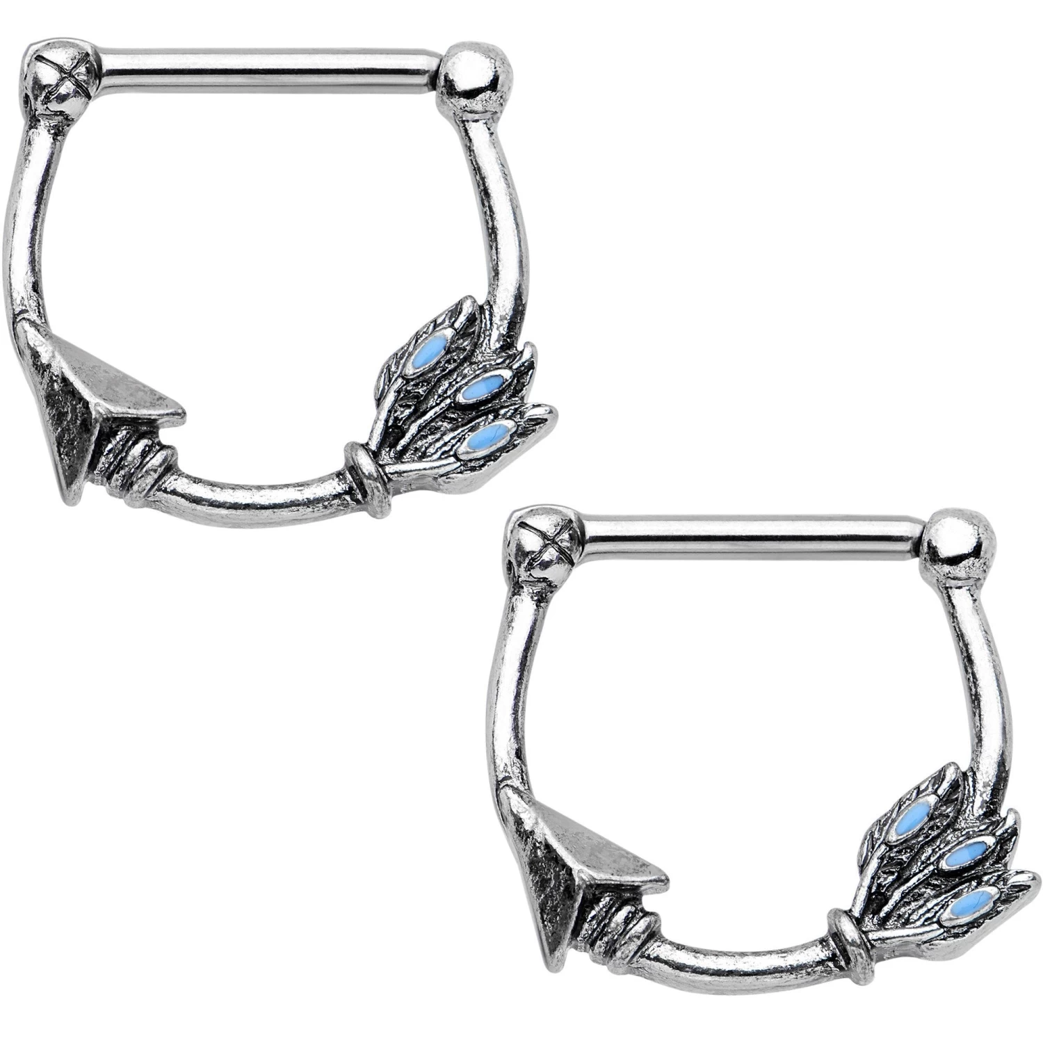 This stone-age inspired spear with a feather tail will look awesome shot through your nipple piercing! These 14 gauge hinged barbell nipple rings feature a southwestern style spear with blue accented feathers on one end, and a spear tip on the other. The 10mm straight barbell is made with durable 316L surgical grade stainless steel. Sold as a set of two.