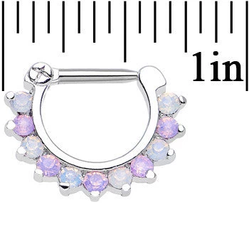 Change up your look with this brilliant septum clicker and its row of glimmering imitation opal and sparkling gems. The 14 gauge, 8mm stainless steel barbell septum clicker has a hinge that easily opens and clicks closed fashioned with a rhodium plated base metal hoop. Pierced septum jewelry.