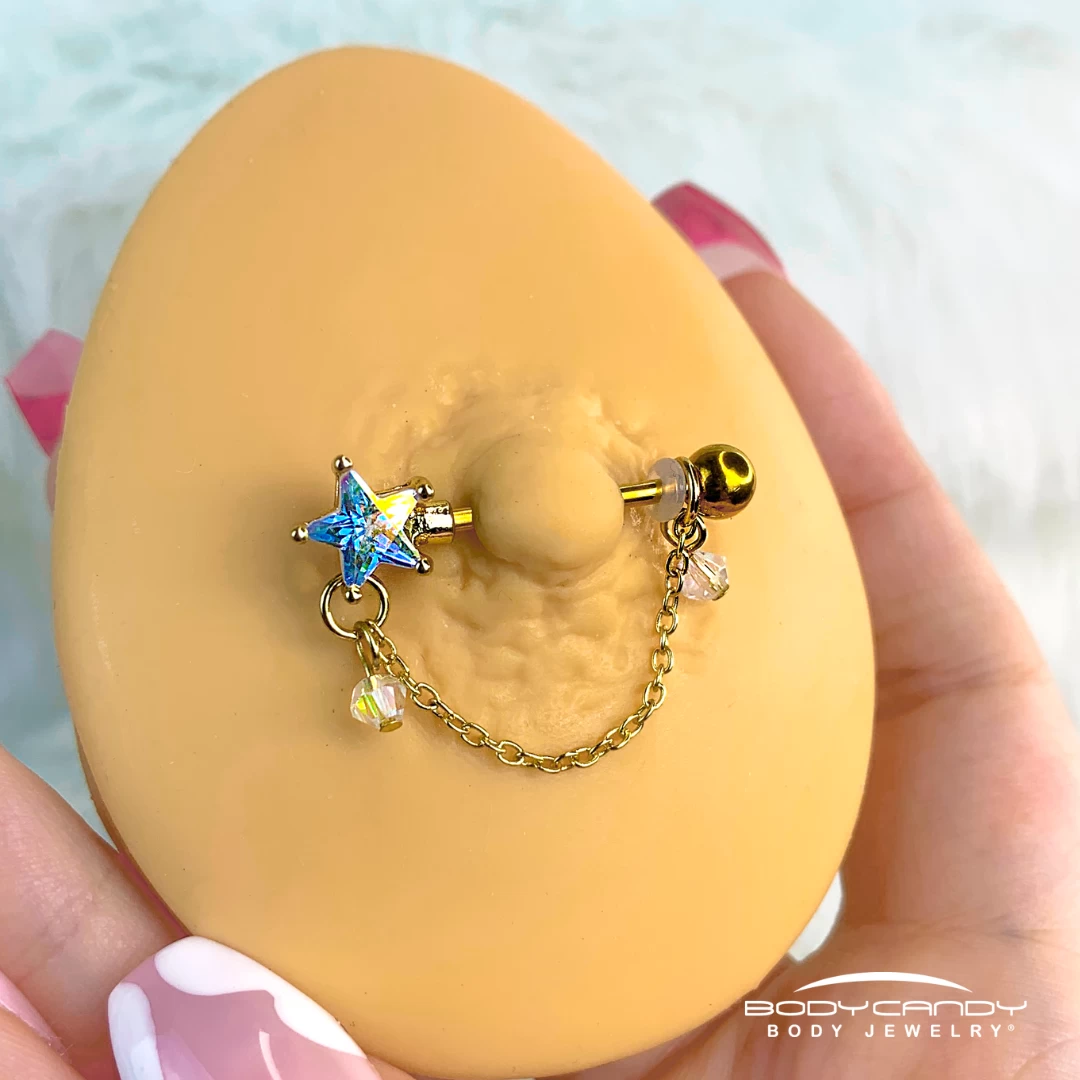 The stars in the sky will wish they looked as good as these stars will look in your nipple piercings! The 14 gauge nipple jewelry is made with 16mm gold tone plated over 316L surgical grade stainless steel straight barbells. One end is a ferido-style ball end paved in tiny aurora gems. The other end is made with large star-shaped aurora gem charms that feature chain dangles with a tiny clear bead at each end. Sold as a set of two.