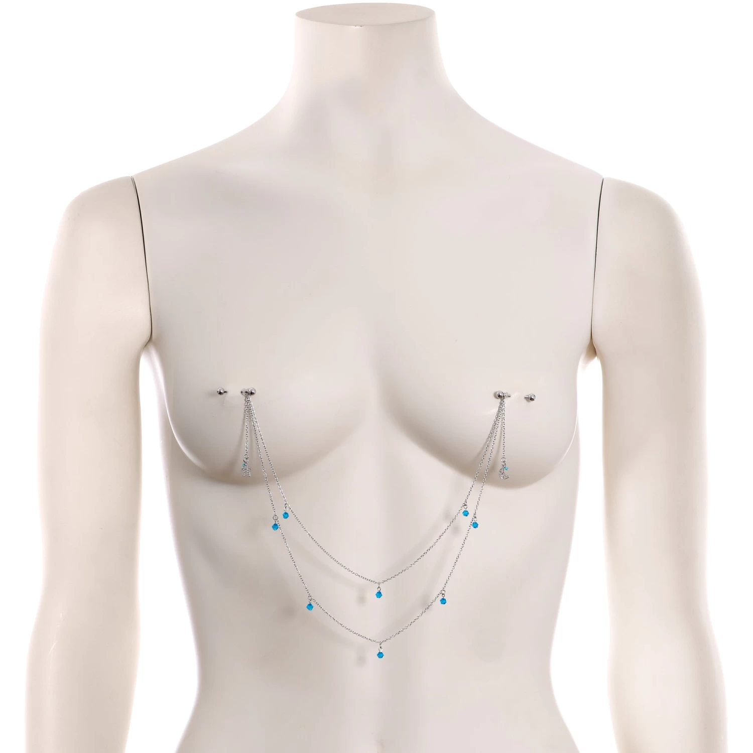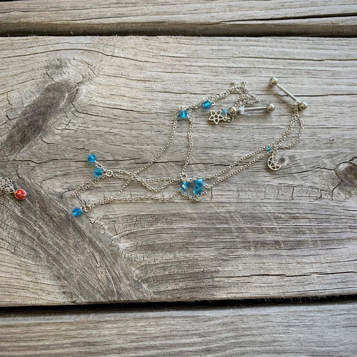 You don’t need to wait until a blue moon to make your nipple piercings look their best with this 14 gauge jewelry! It’s made with 16mm durable 316L surgical grade stainless steel straight barbells with 5mm ball ends. Between the barbells hangs a double length of chain with the top chain being 12″ in length and the bottom one being 14″ in length. The chains support tiny blue gems; one with a star charm and the other with a crescent moon charm. It’s tiny details like this that make this a striking and elegant piece of nipple jewelry that you’re sure to love!
