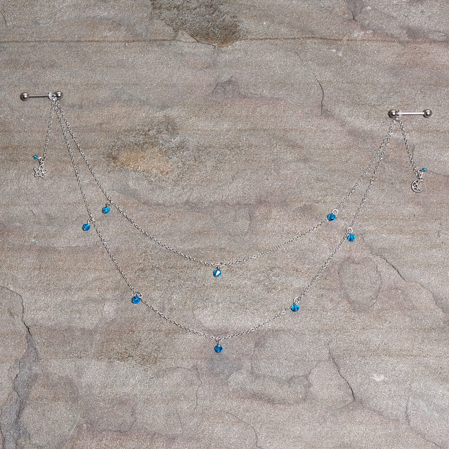 14 Gauge 5/8 Blue Gem Moon Star Double Dangle Nipple Chain