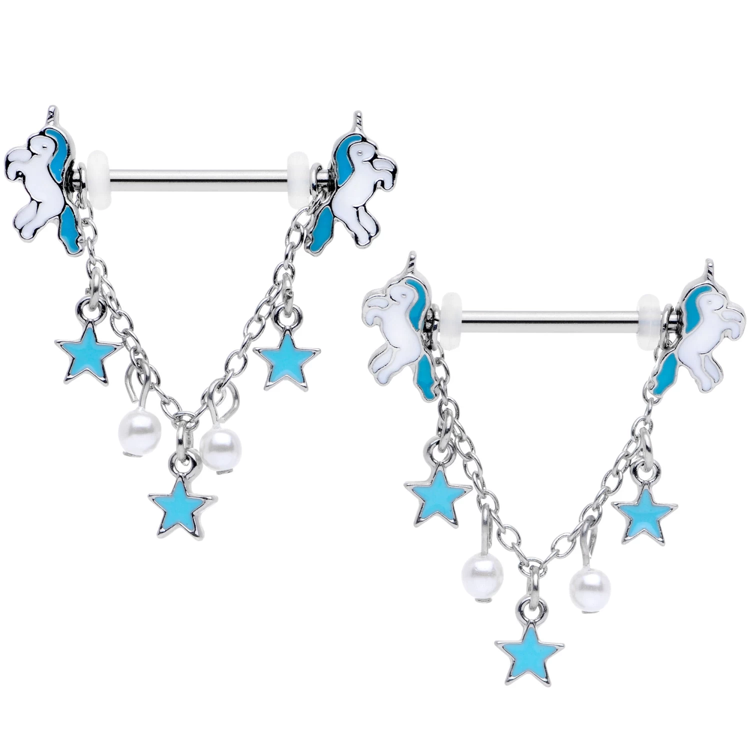 14 Gauge 5/8 Blue White Unicorn Star Chain Dangle Nipple Ring Set