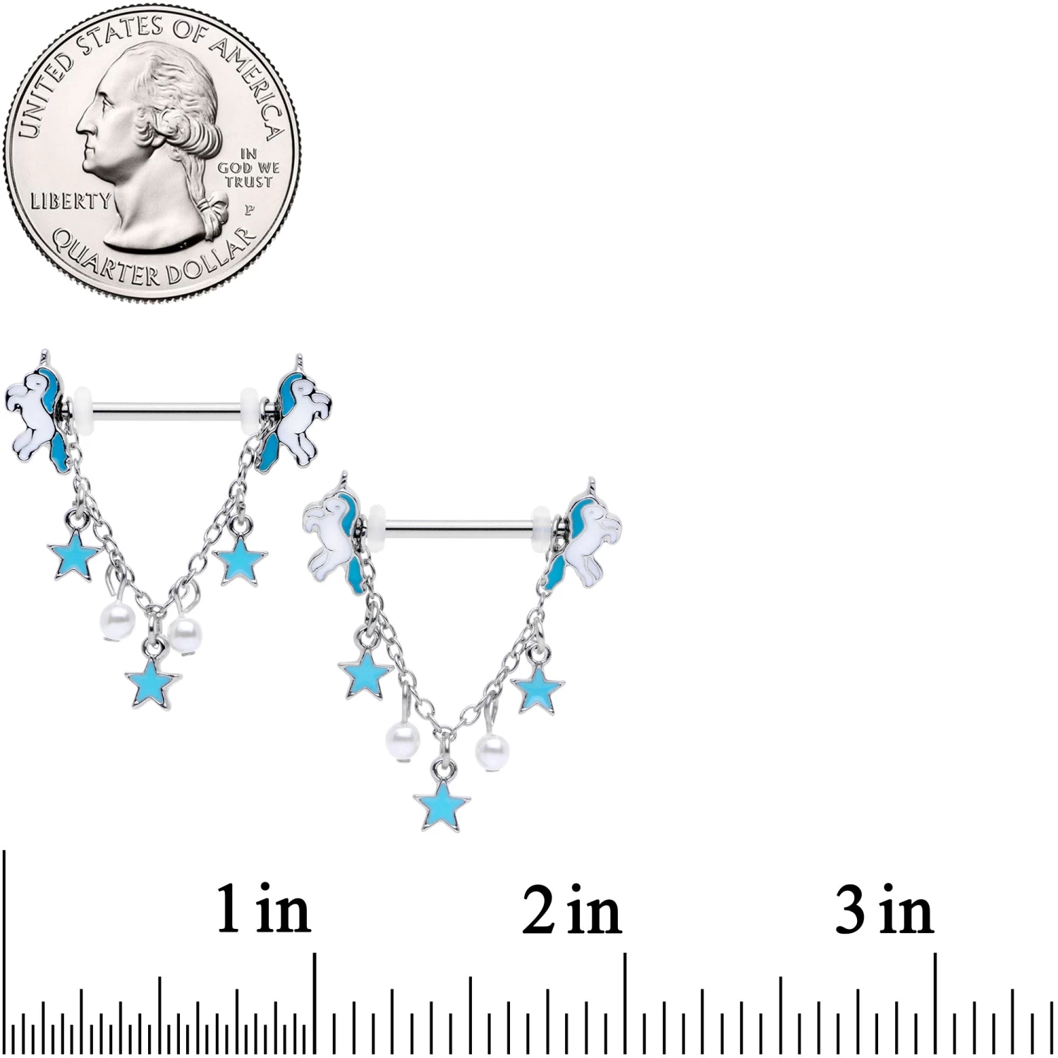 Give these unicorns a starring role with this 14 gauge nipple piercing jewelry! It’s made with 16mm durable 316L surgical grade stainless steel straight barbells with unicorn charm ends. The unicorns have white with blue manes and tails. Dangling from the barbell is a length of chain that features three blue star charms, which are interspersed with two small pearlescent white orbs for a look that adds a little extra indulgence to these whimsical nipple barbells. You’re sure to have a look that’s as one-of-a-kind as a unicorn! Sold as a set of two.