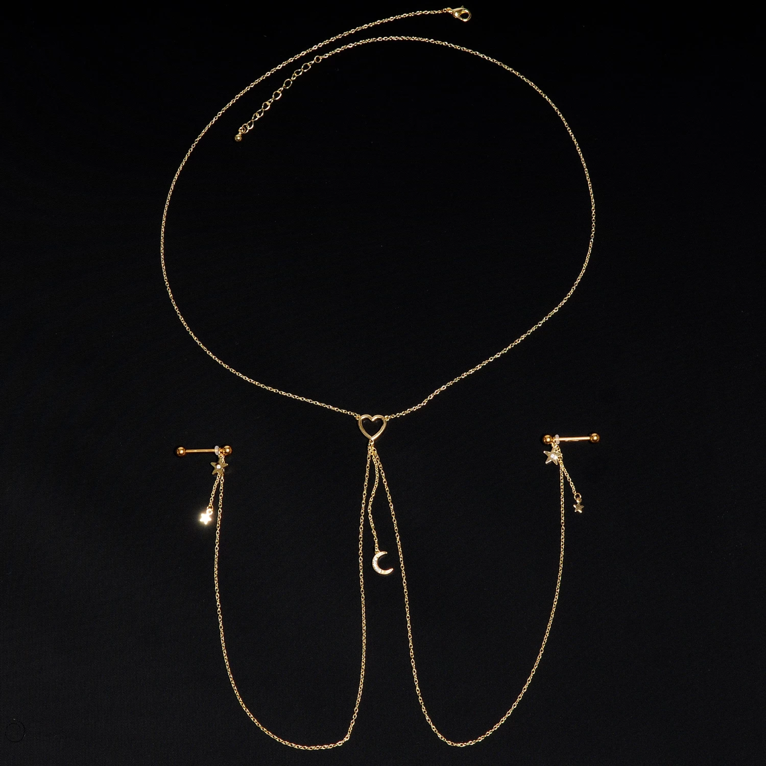 You’re going to love this necklace to nipple chain to the stars and back! It features a 14″ length gold tone necklace that has an openwork heart charm at the center. The heart has three lengths of matching chain dangling from it. The center one is 2″ in length and supports gorgeous crescent moon charm set with clear gems. The other two chains are 12″ and connect to the 16mm gold tone plated over 316L surgical grade stainless steel straight barbells with 5mm ball ends. Dangling from the barbells are gold tone star charms with a single clear gem and tiny unadorned gold tone star charms than dangle from a 1″ length of chain. With this stunning necklace nipple chain, your nipple piercings are sure to be stars!