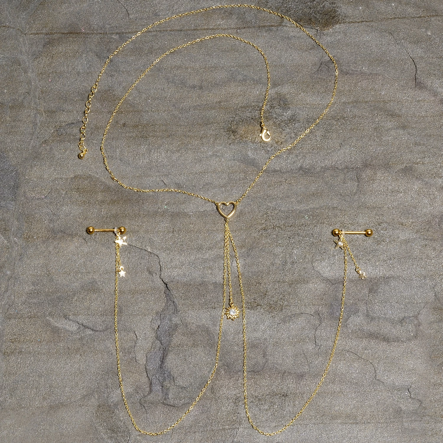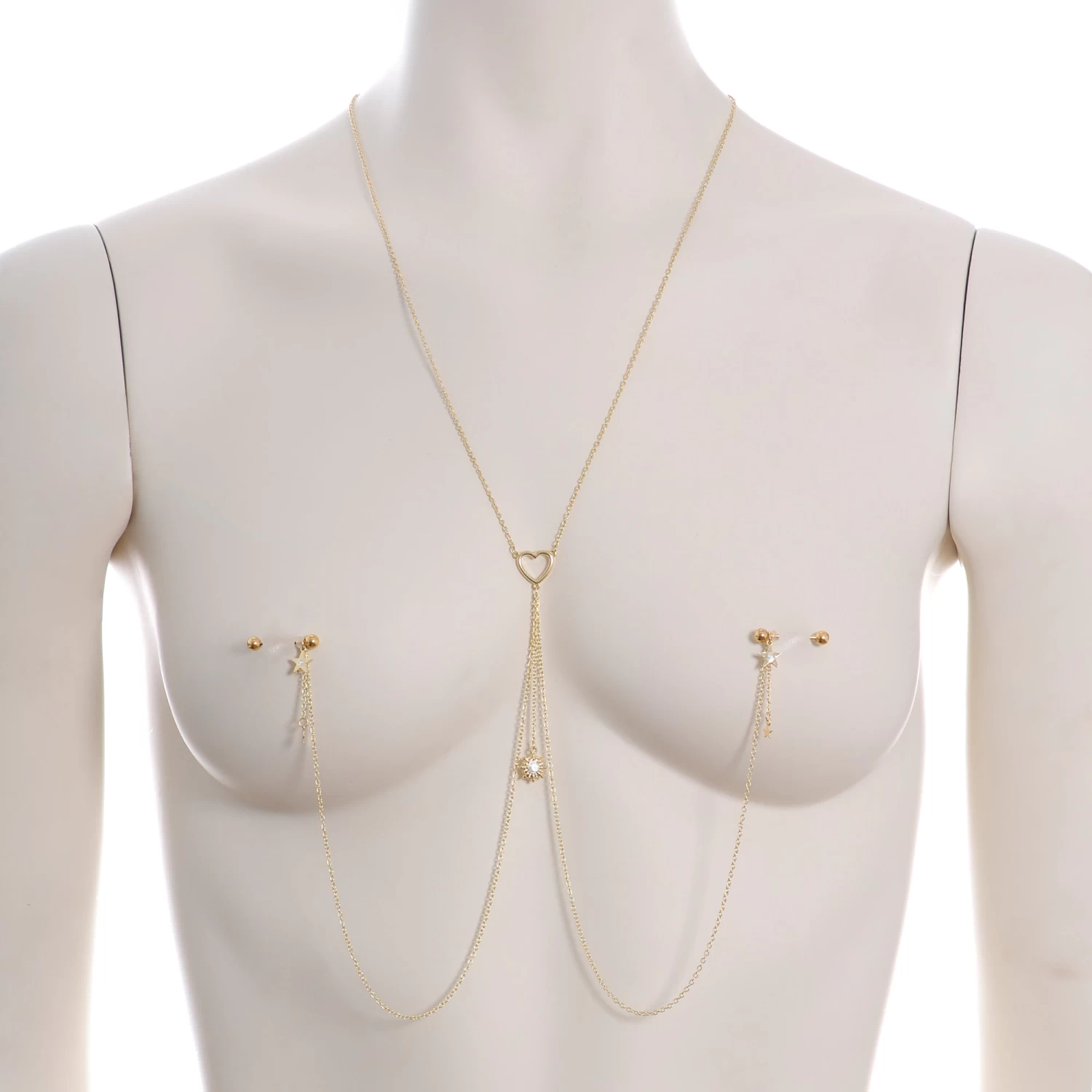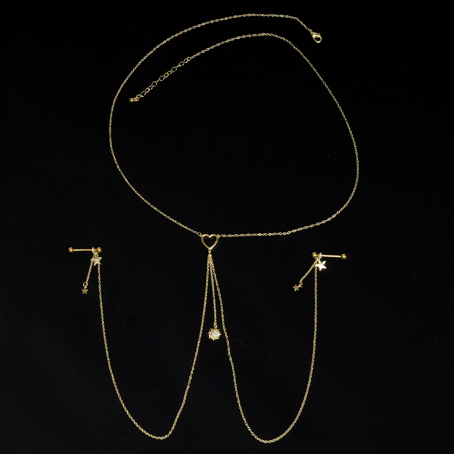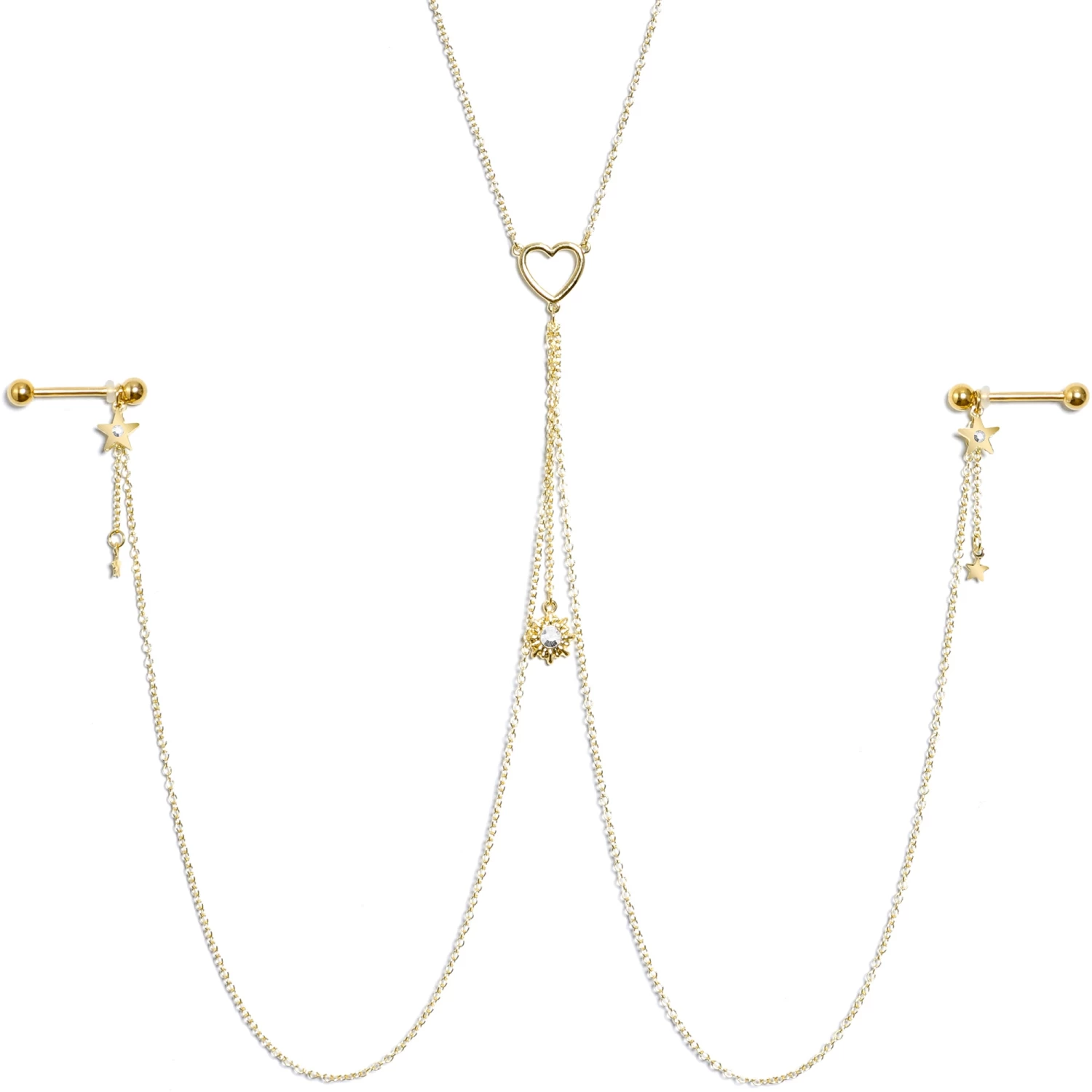 You’re going to love this necklace to nipple chain to the stars and back! It features a 14″ length necklace that has an openwork heart charm at the center. The heart has three lengths of matching chain dangling from it. The center one is 2″ in length and supports gorgeous sun charm that’s set with a clear gem in the center. The other two chains are 12″ and connect to the 16mm gold tone plated over 316L surgical grade stainless steel straight barbells with 5mm ball ends. Dangling from the barbells are star charms with clear gems and tiny unadorned stars than dangle from 1″ lengths of chain. With this stunning necklace nipple chain, your pierced nipples are sure to be stars!