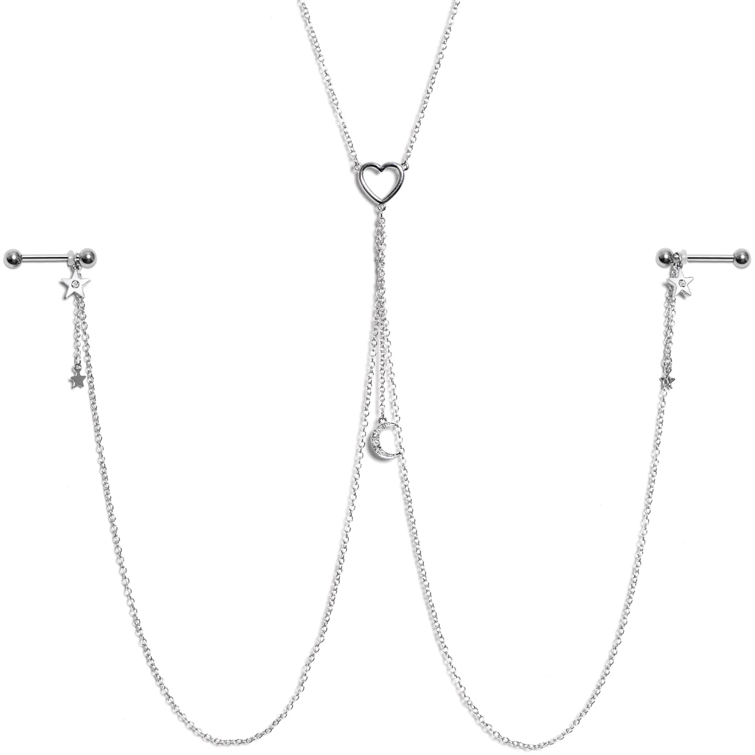 14 Gauge 5/8 Clear Gem Moon Heart Star Nipple Chain Necklace