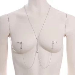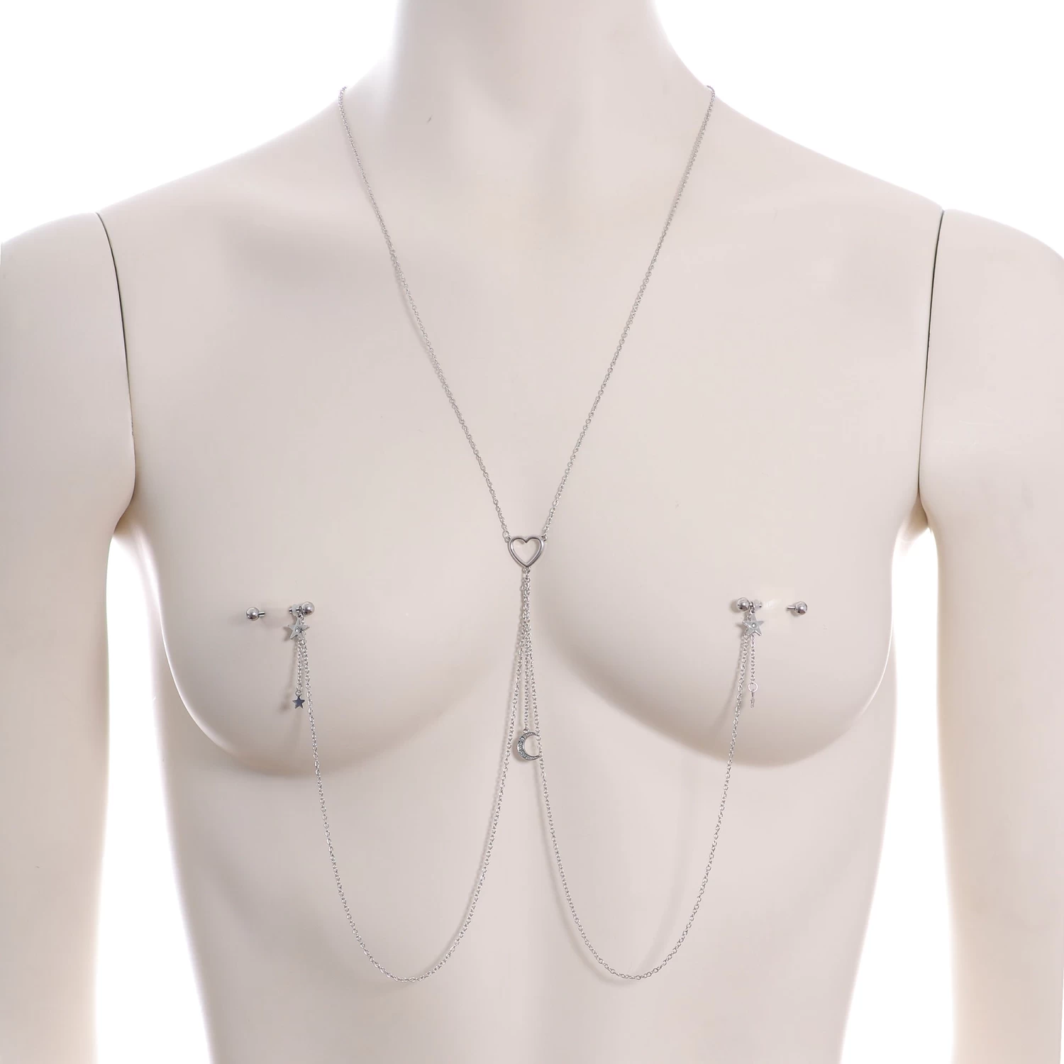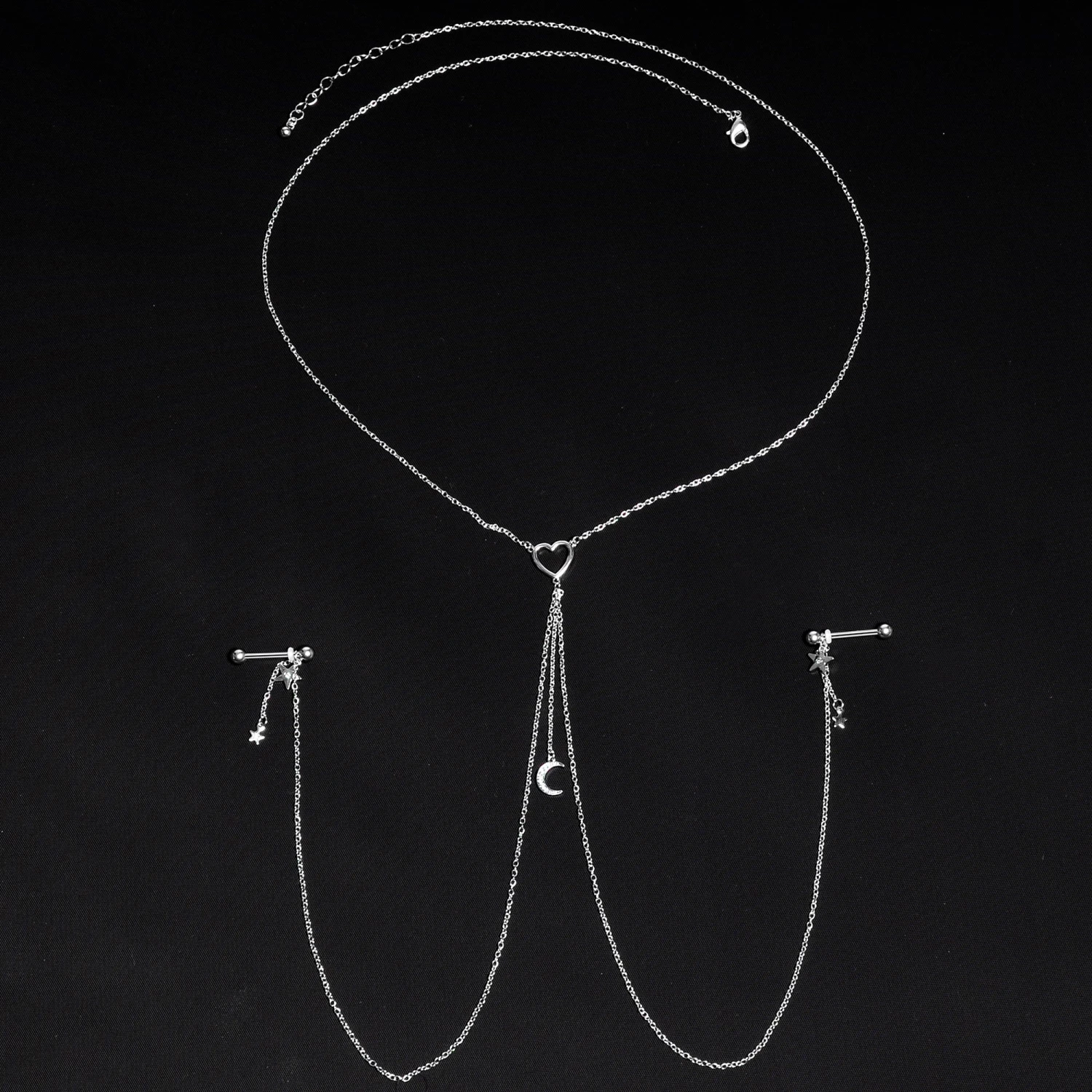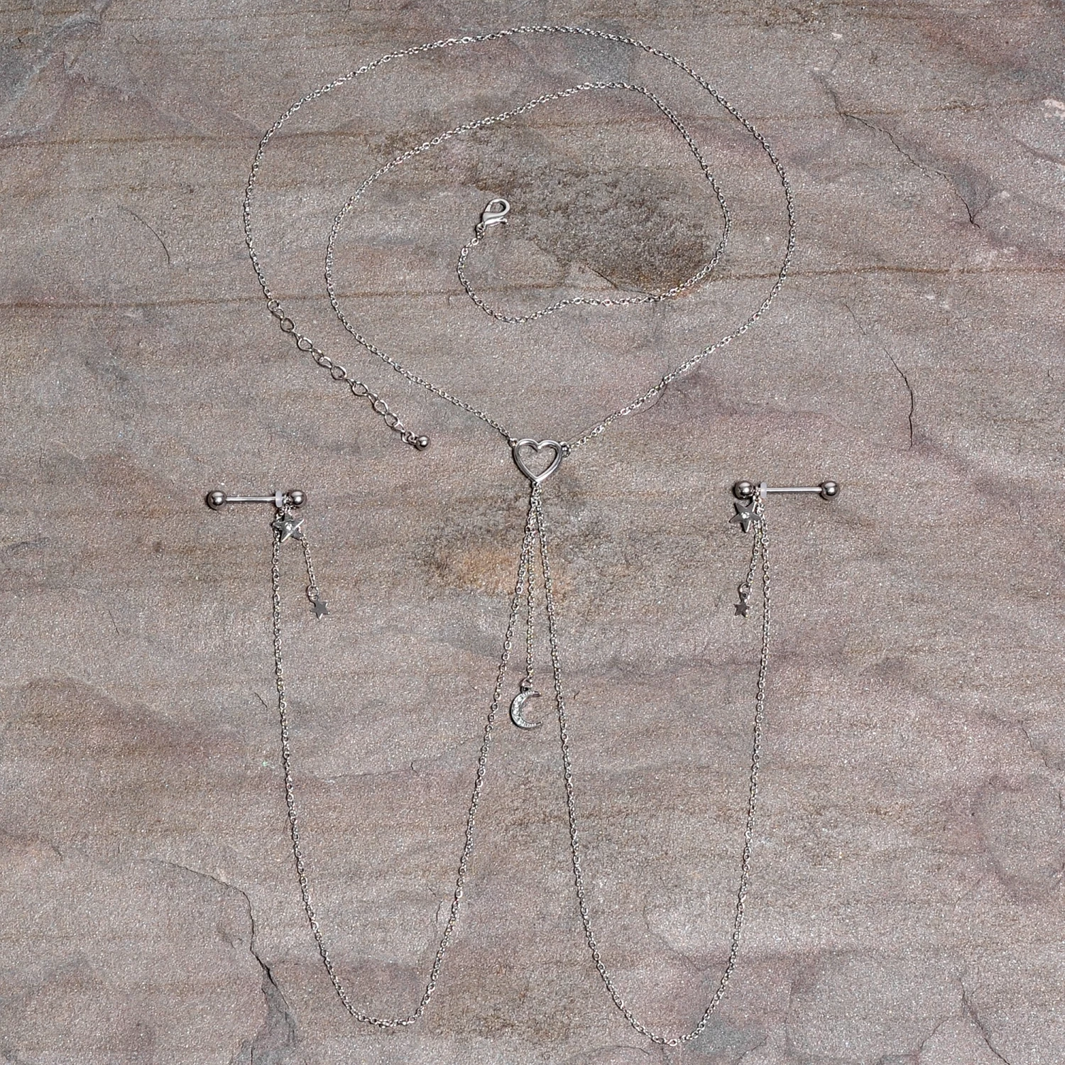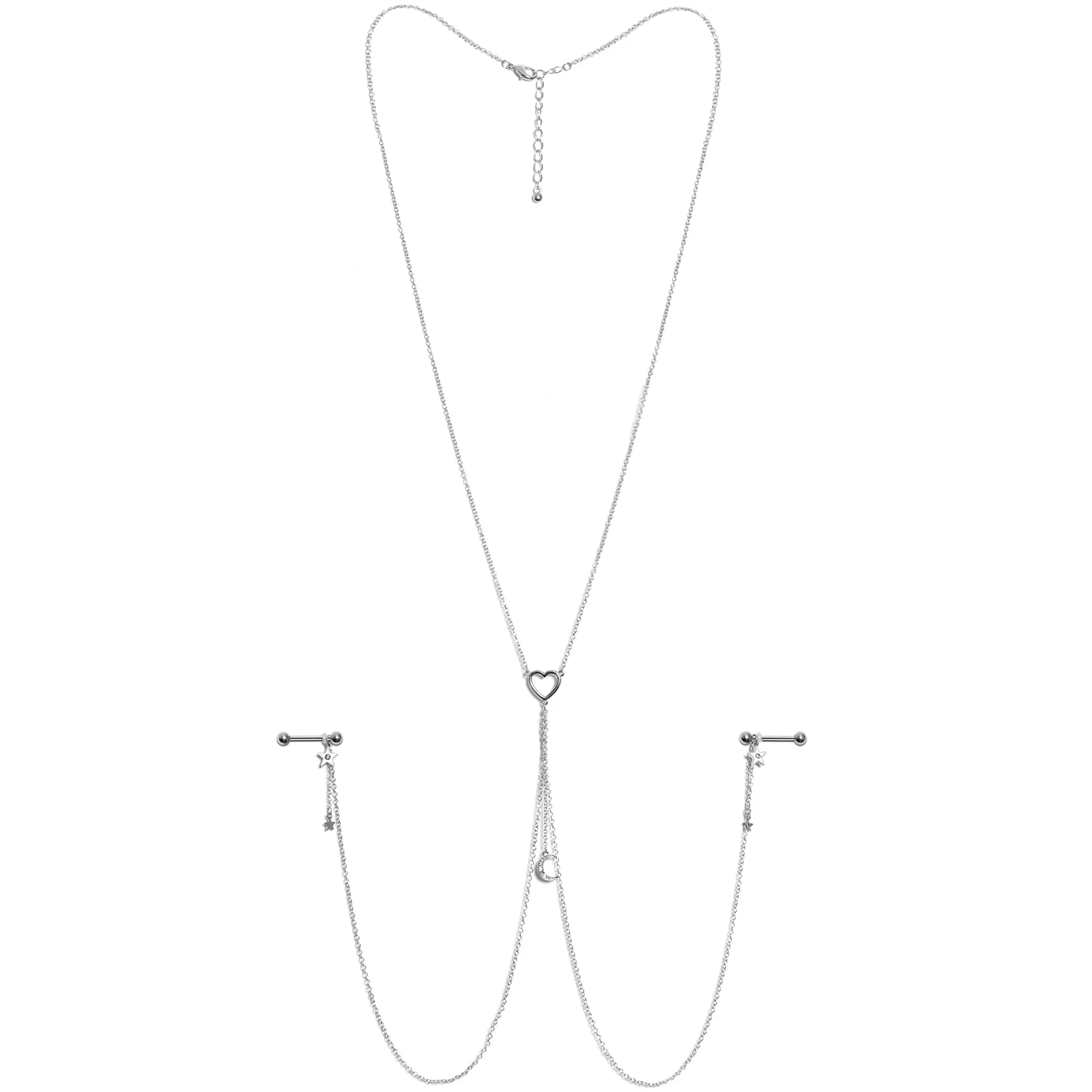 You’re going to love this necklace to nipple chain to the stars and back! It features a 14″ length necklace that has an openwork heart charm at the center. The heart has three lengths of matching chain dangling from it. The center one is 2″ in length and supports gorgeous crescent moon charm that’s set with clear gems. The other two chains are 12″ and connect to the 16mm durable 316L surgical grade stainless steel straight barbells with 5mm ball ends. Dangling from the barbells are star charms with a single clear gem and tiny unadorned star charms than dangle from 1″ lengths of chain. With this stunning necklace nipple chain, your piercings are sure to be stars!