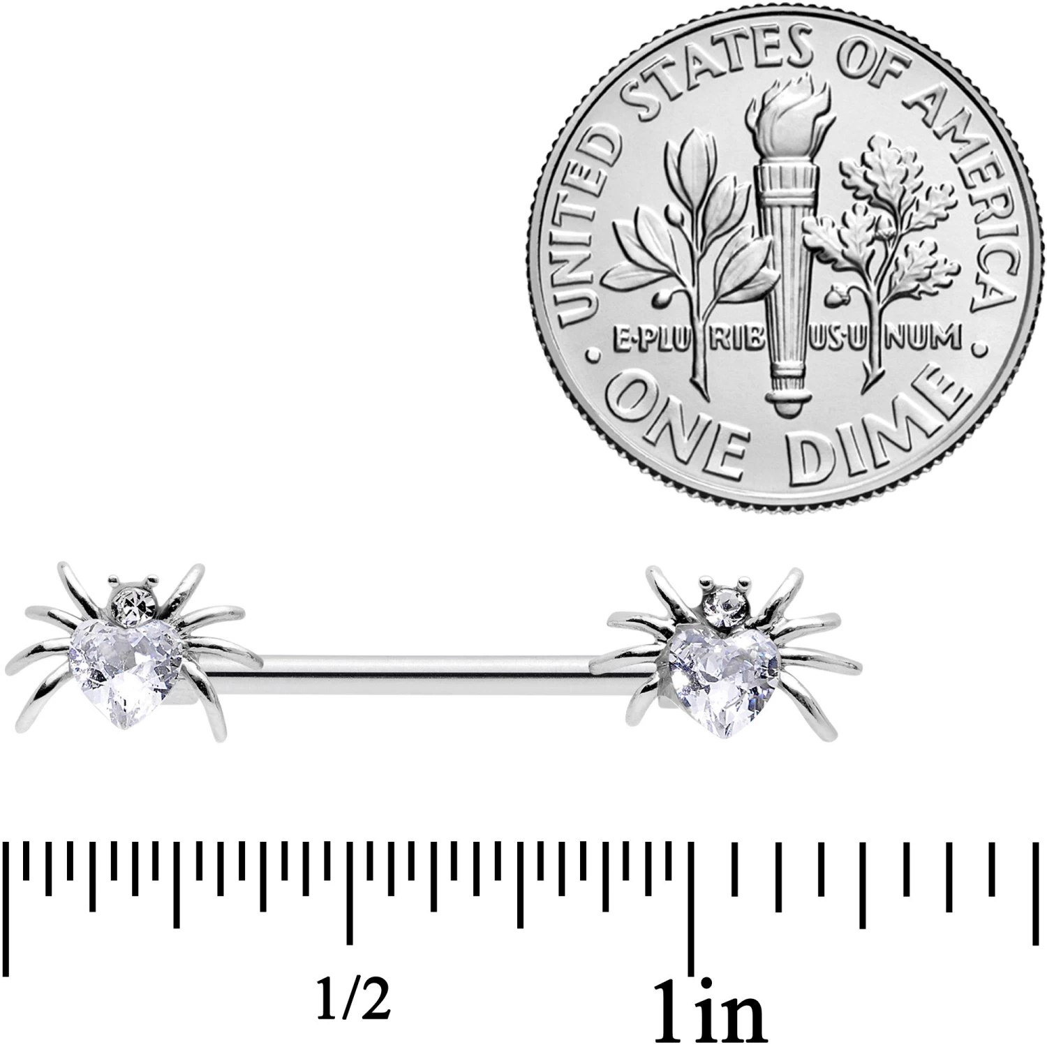 These little spiders will give you the shivers this Halloween…but not shivers of fear! This 14 gauge nipple jewelry is made with 16mm durable 316L surgical grade stainless steel straight barbells. The ends feature beautiful spider charm ends with the spider’s bodies made of heart-shaped Valentine’s Day clear gems with the head composed of smaller clear gems. So whether you cherish creepy crawlies or appreciate arachnids, these nipple piercing rings are sure to snare you in their web! Sold as a set of two.