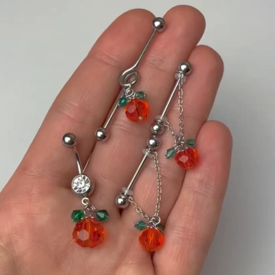 Pick the best pumpkin in the patch with this 14 gauge nipple jewelry! It’s made with 16mm durable 316L surgical grade stainless steel straight barbells with 5mm ball ends. Each barbell features a dangling length of chain that supports a pumpkin charm, composed of a large orange gem. The pumpkin also features green gem leaves for a colorful and realistic look. Pick a winning Halloween-themed nipple piercing look with this perfect pumpkin nipple jewelry! Sold as a set of two.