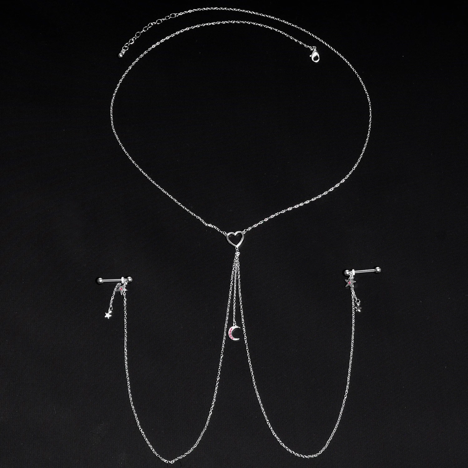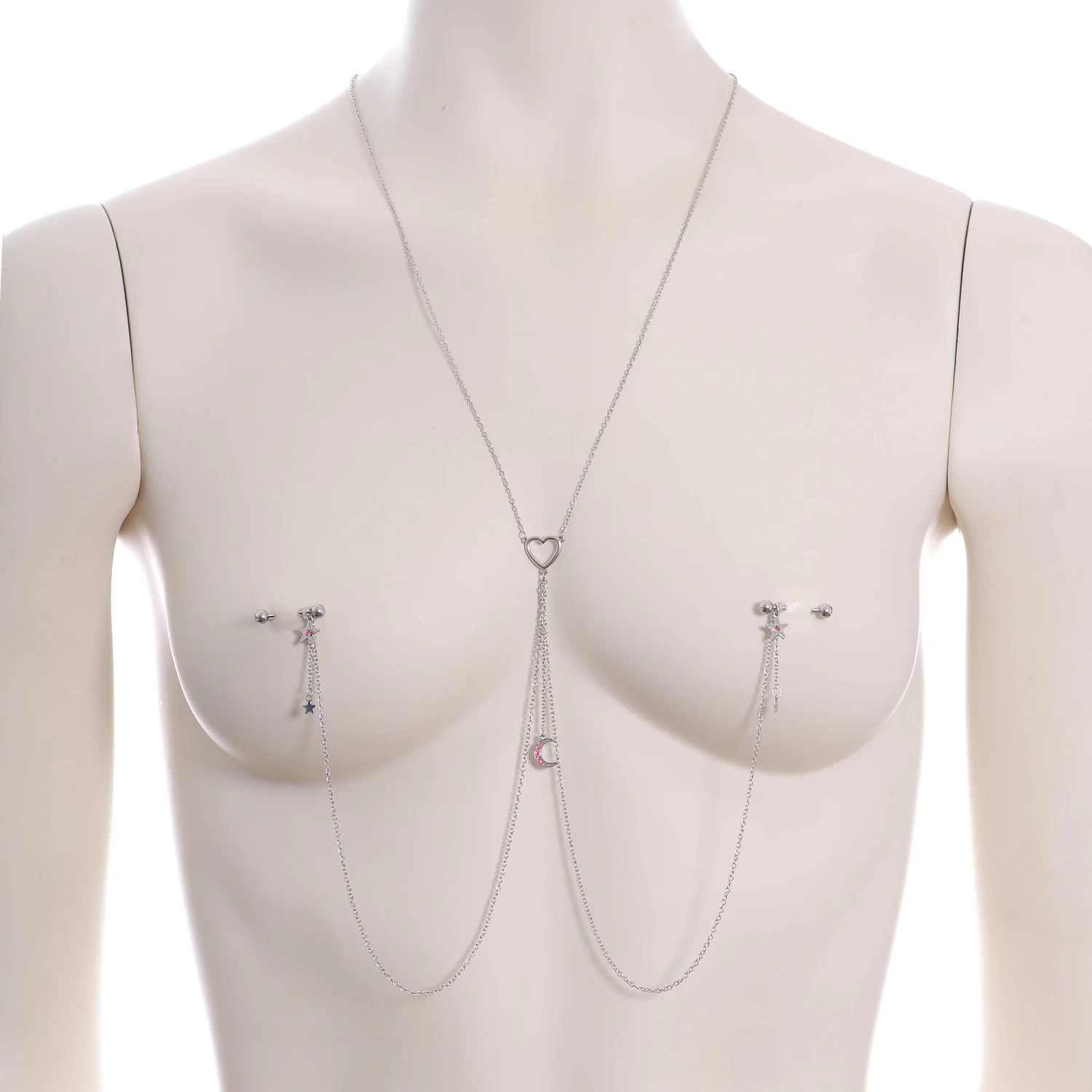 You’re going to love this nipple chain necklace to the stars and back! It features a 14″ maximum necklace that has an openwork heart at the center. The heart has three lengths of matching chain dangling from it. The center one is 2″ in length and supports gorgeous crescent moon charm that’s set with pink gems. The other two chains are 12″ and connect to the 16mm durable 316L surgical grade stainless steel straight barbells with 5mm ball ends. Dangling from the barbells are star charms with pink gems set at the center and tiny unadorned star charms than dangle from a 1″ length of chain. With this stunning necklace nipple chain, your piercings are sure to be stars!