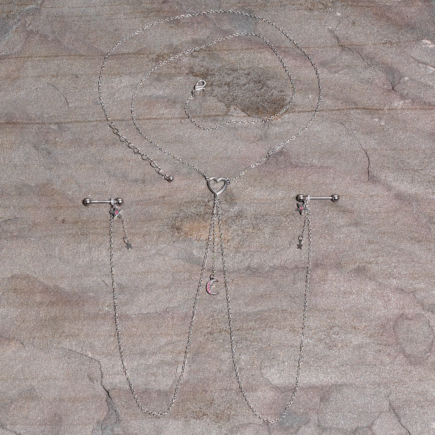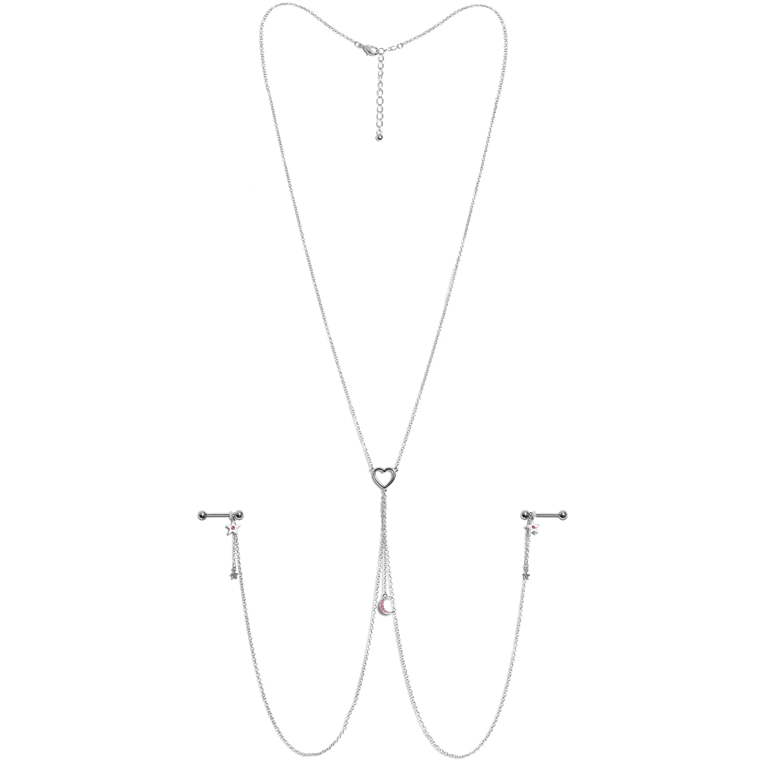 14 Gauge 5/8 Pink Gem Moon Heart Star Nipple Chain Necklace