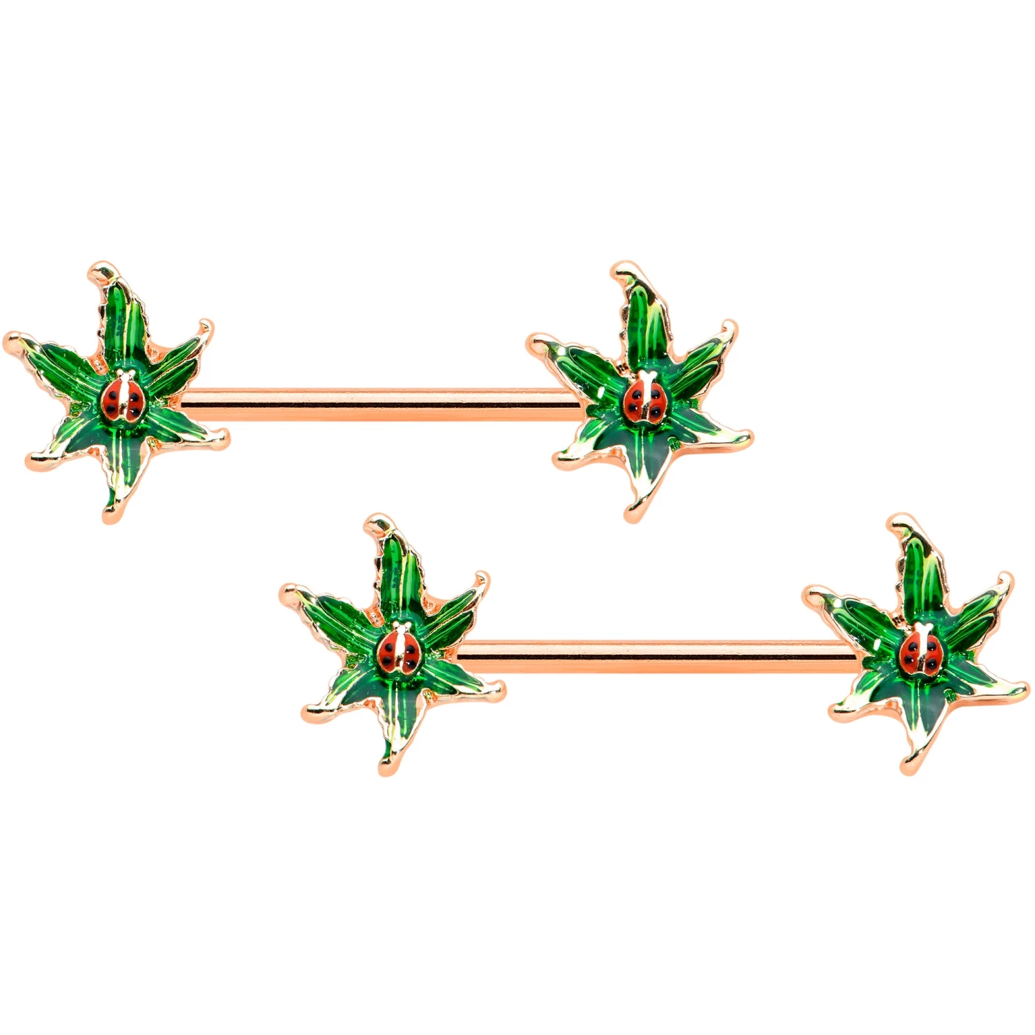 The little ladybugs on this 14 gauge nipple jewelry have found a perfectly gorgeous place to chill! They’re made with a 16mm rose gold tone plated over 316L surgical grade stainless steel straight barbells. Each of the ends features a leaf charm, with multiple deep green leaves spread out like a star. At their centers is a tiny ladybug embellishment, a sweet surprise for those who look closer. Let your style feel as relaxed and contemporary as the ladybugs on these charming nipple piercing rings! Sold as a set of two.