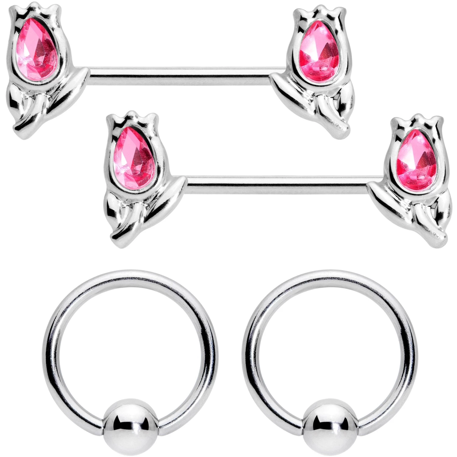 Spring is approaching and that means it’s time for tulips! This 14 gauge nipple piercing set features a set of 11mm durable 316L surgical grade stainless steel straight barbells. The ends are stylized tulips, with a curved shape and set with pink gems that keep their simple beauty from being plain. You also get a set of 12mm durable 316L surgical grade stainless steel captive rings for a look that is timeless and has a classic appeal. Celebrate spring with whichever look suits your fancy – this set of nipple jewelry has you covered! Sold as a set of four.
