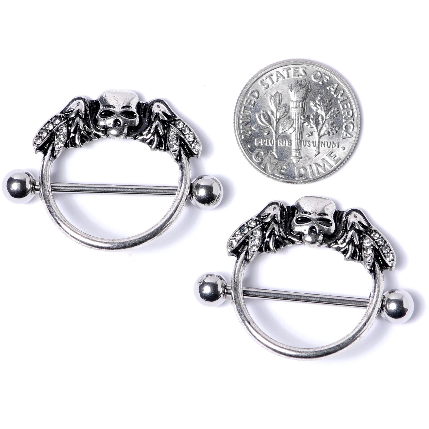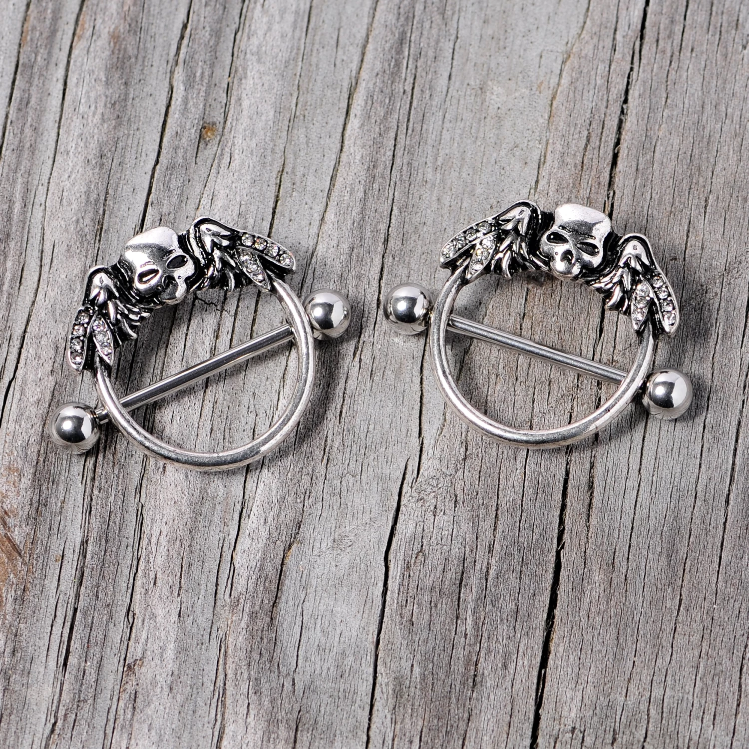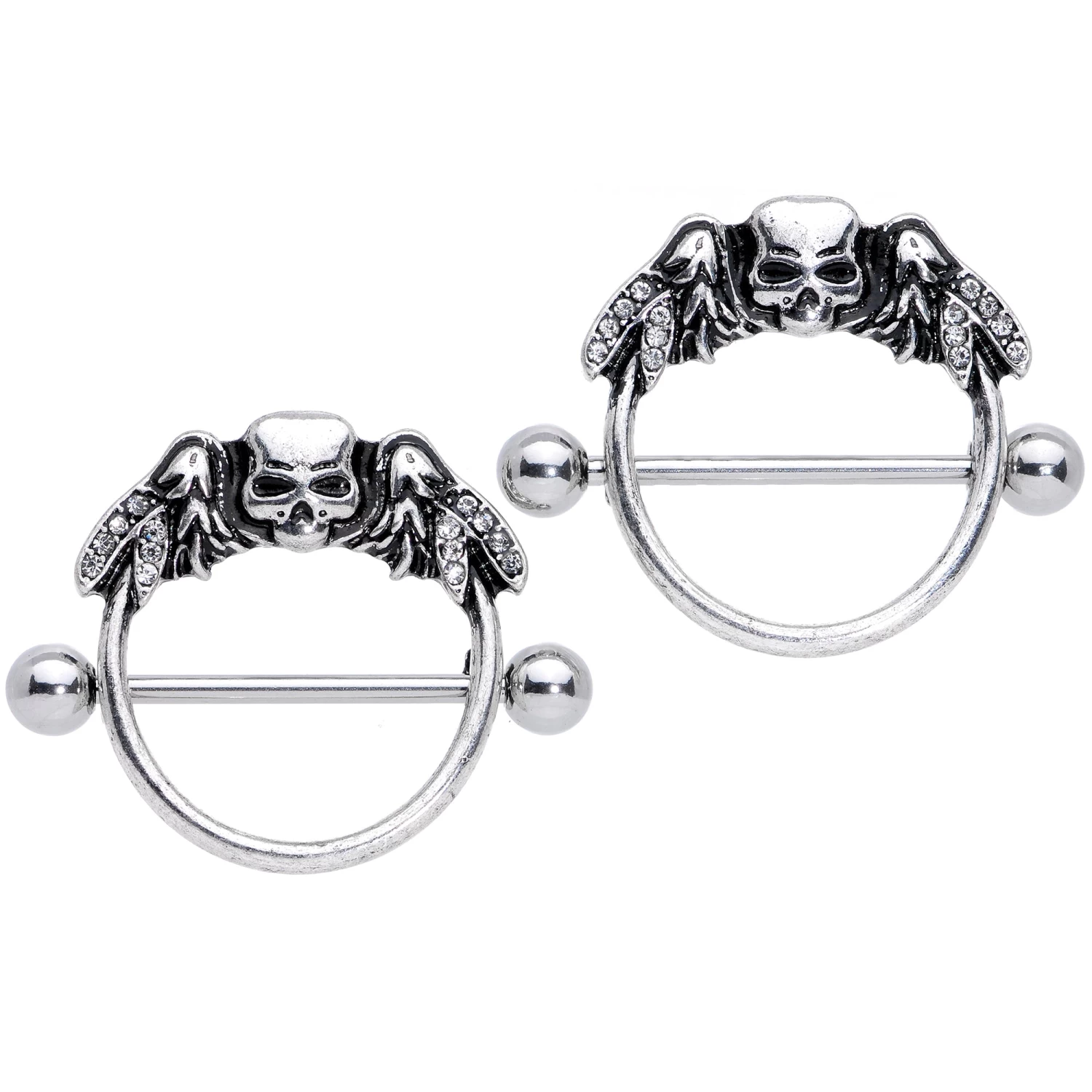 It’s the spookiest time of year but there will be nothing to fear when you wear these fun 14 gauge nipple piercings that have scary style. Made with 22mm durable 316L surgical grade stainless steel straight barbells, this nipple jewelry features round ring skull shield charms with wing details set with clear gems. Sold as a set of two for you or your Halloween crew.