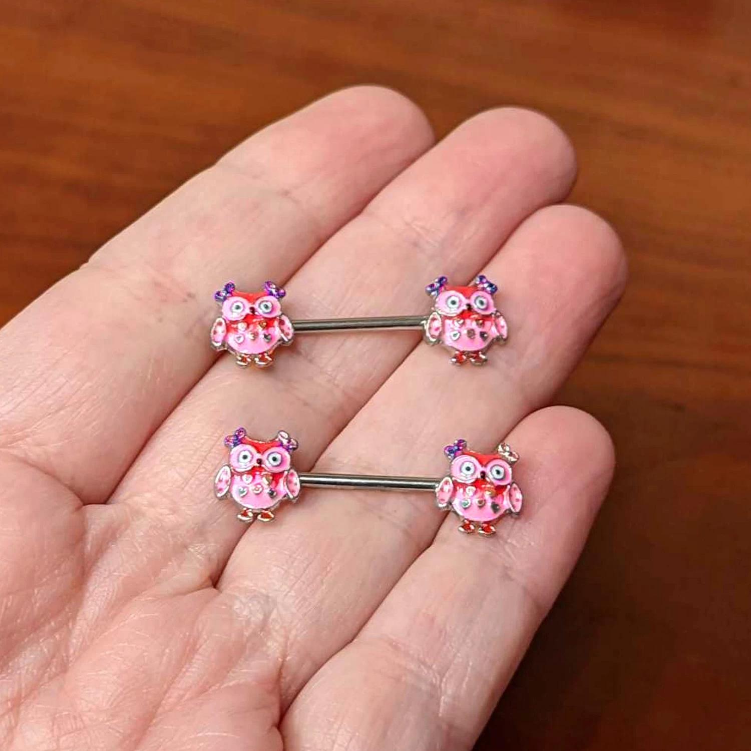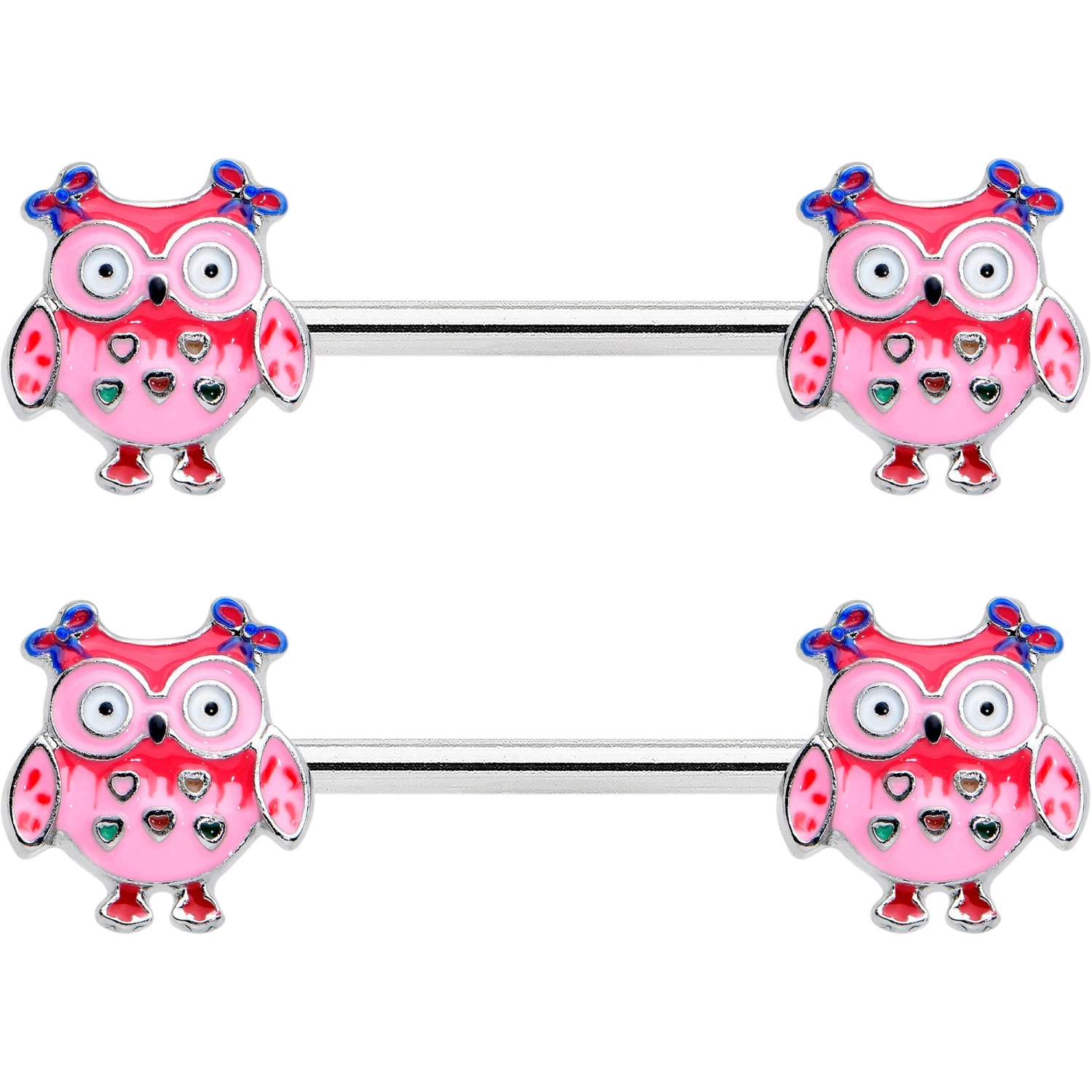 Someone’s all gussied up for Valentine’s Day…like the owls on this 14 gauge nipple jewelry! It’s made with 14mm durable 316L surgical grade stainless steel straight barbells. Each of the ends features a pink inlaid owl charm. The owls are embellished with little hairbows and also features little hearts on their chests. Give your nipple piercings some whimsical avian action with these charming nipple piercing rings! Sold as a set of two.
