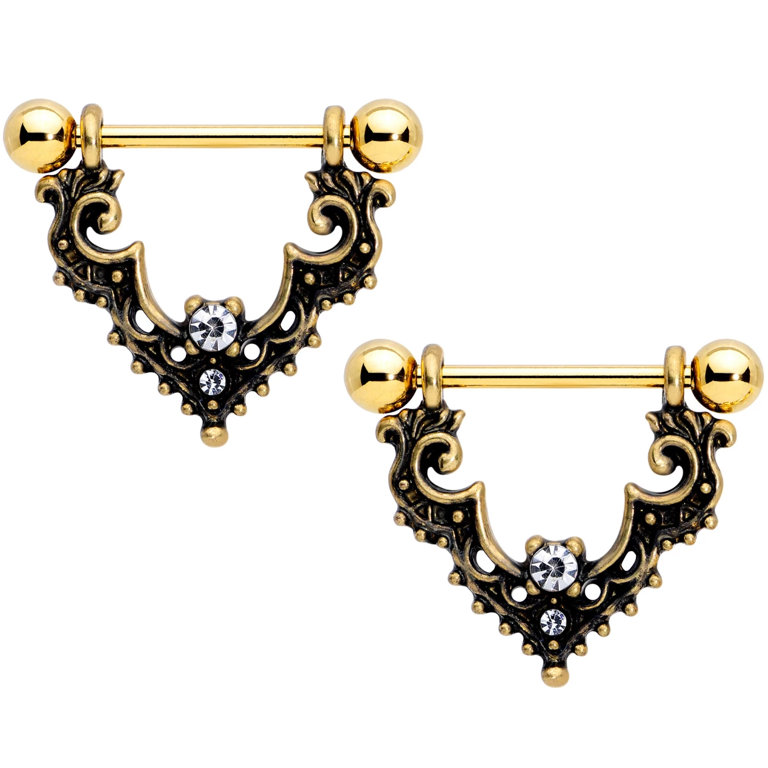 14 Gauge 9/16 Clear Gem Gold Tone Baroque Bat Nipple Shield Set