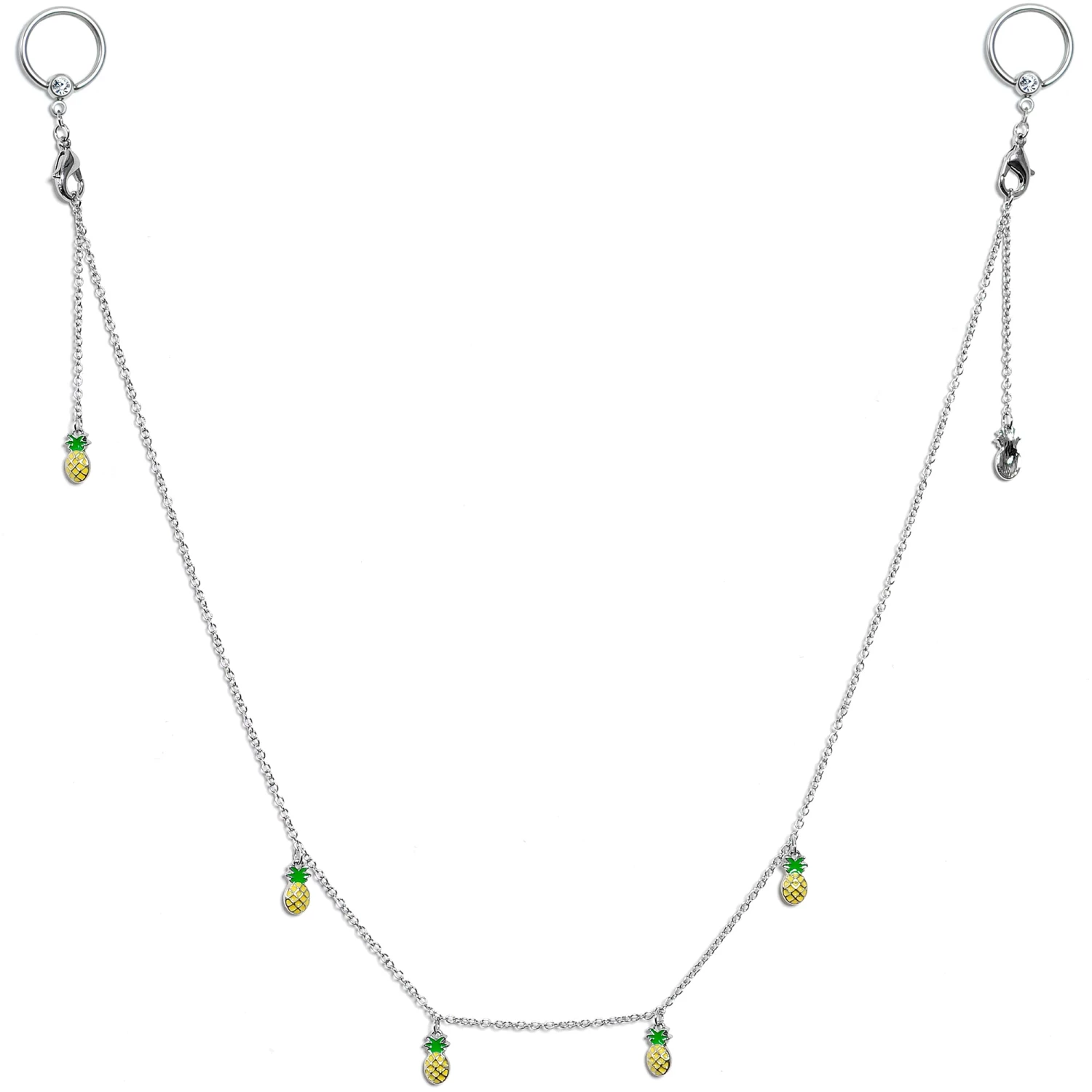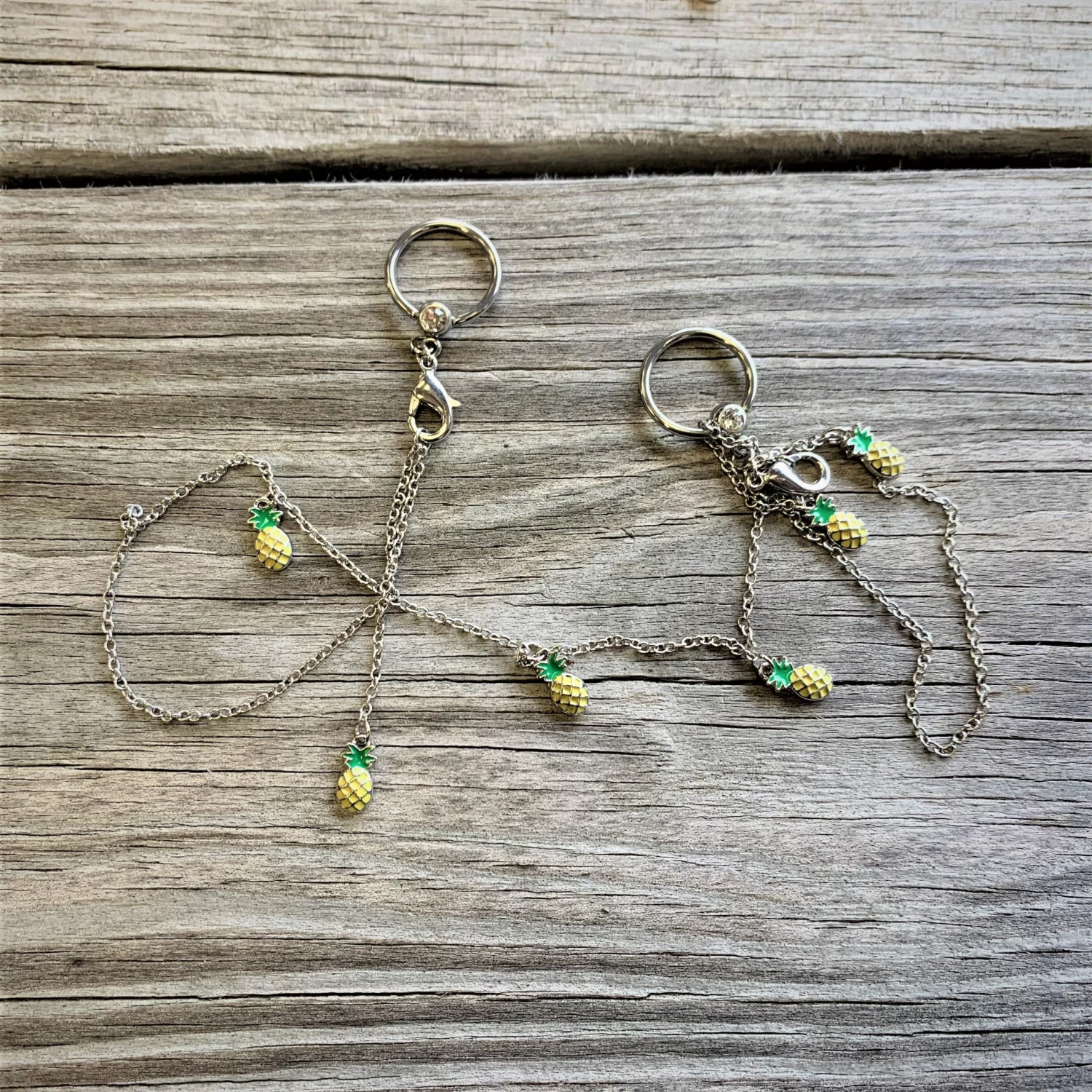 Give yourself a taste of summer any time of year with this 14 gauge tropical pineapple nipple jewelry! It’s made with 14mm durable 316L surgical grade stainless steel circular rings. The rings have 5mm captive beads which are set with a single clear gem each. Between the two rings dangles a 14″ length of chain that supports a number of dangling tropical pineapple charms. Try finding that in your local produce section!