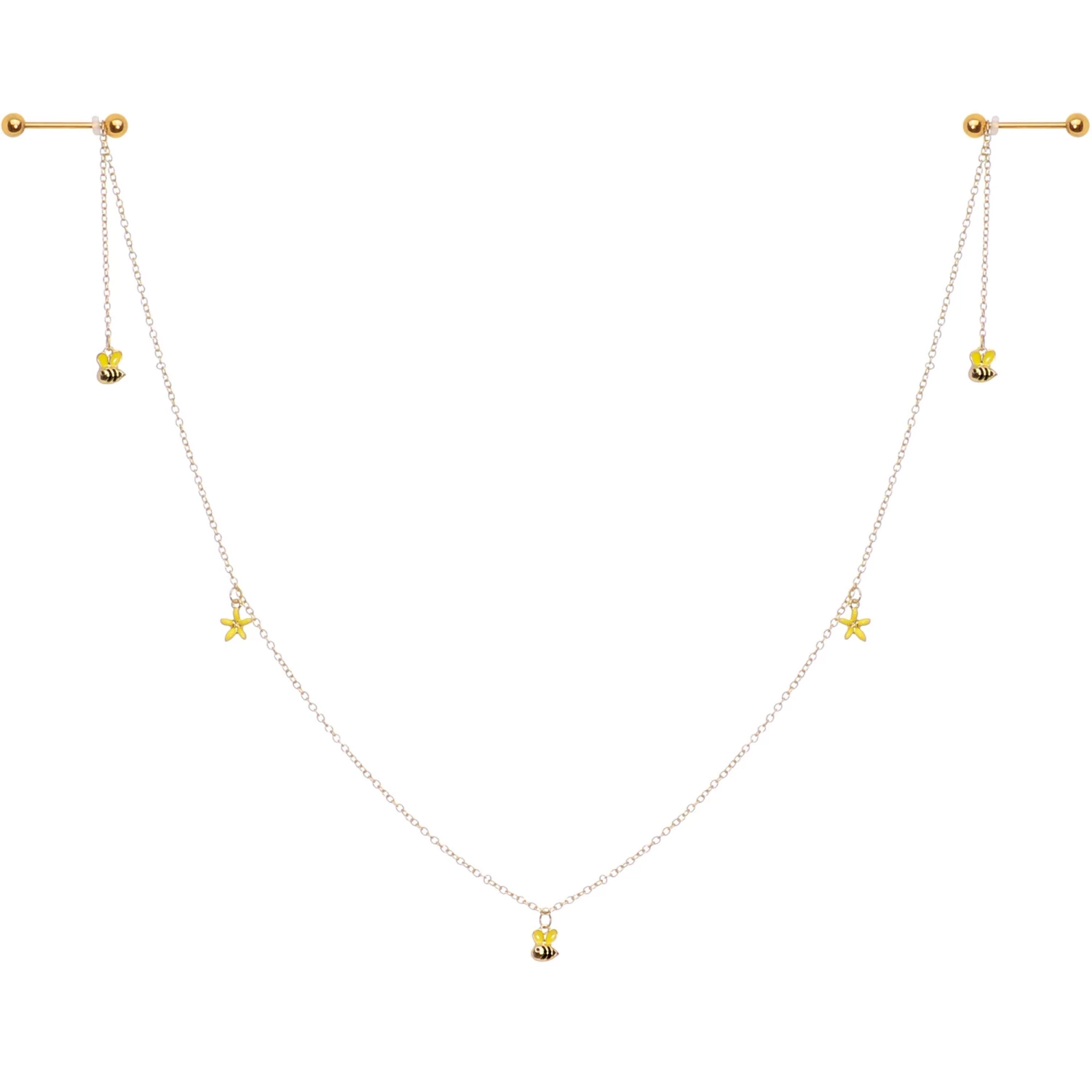 Get ready for the spring and summer season with this pretty 14 gauge dangle nipple jewelry! Made with 14mm gold tone plated over 316L surgical grade stainless steel straight barbells, these nipple piercings feature a 16″ maximum length chain whose position can be adjusted with o-rings as well as yellow flower and bumble bee dangle charms. Perfect for days at the beach and sexy summer nights.