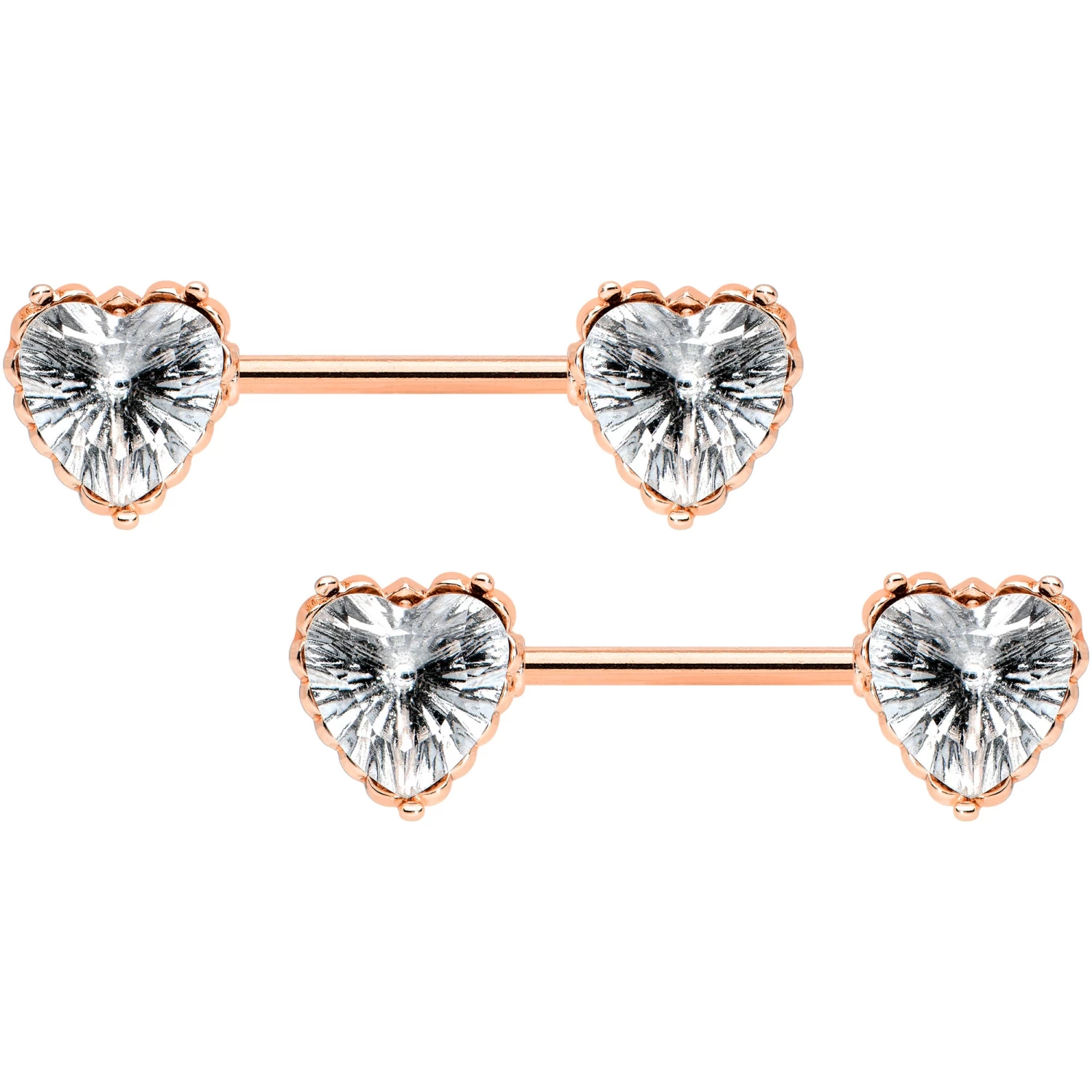 14 Gauge 9/16 Grey CZ Gem Rose Gold Tone Heart Nipple Ring Set