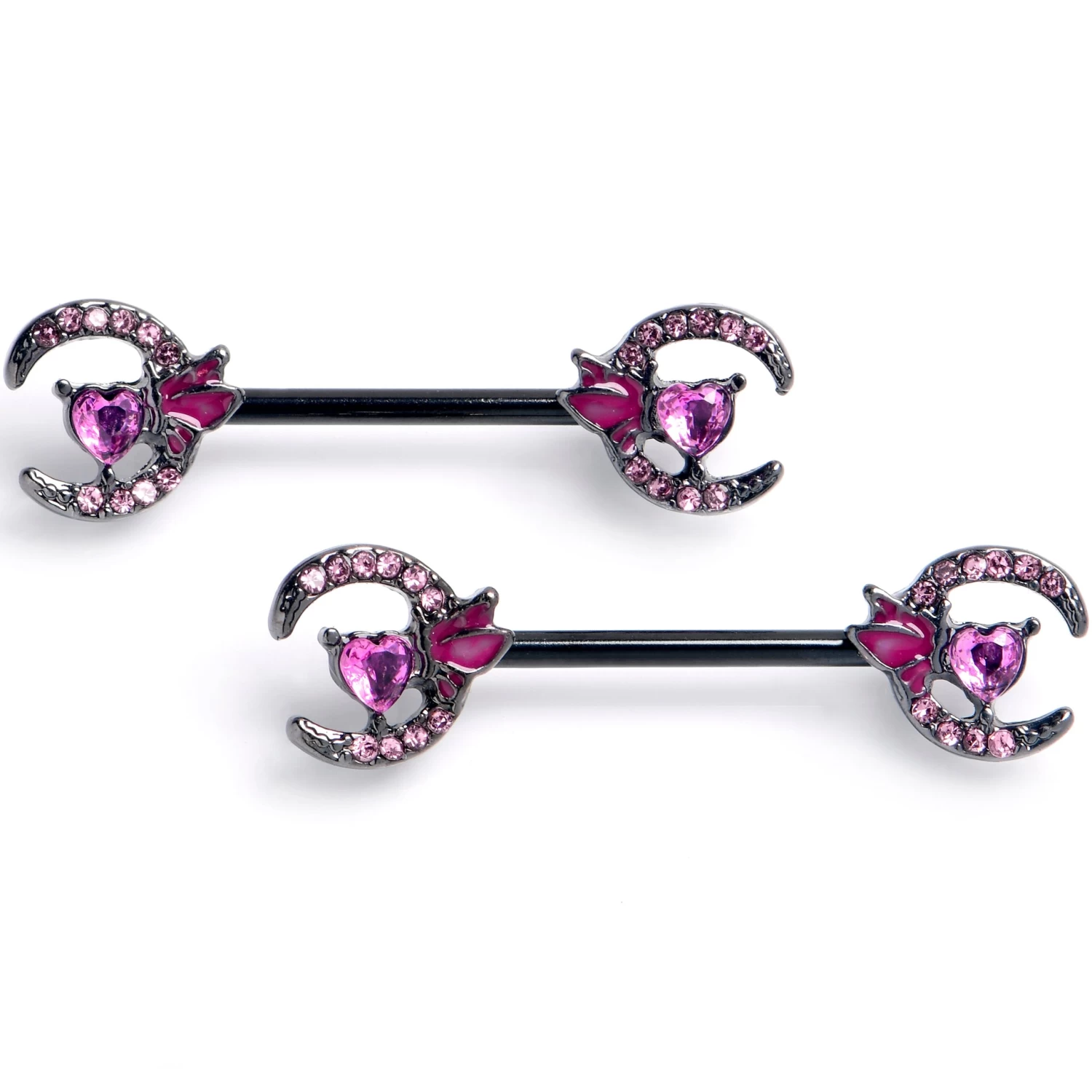Love your piercings all the way to the moon with this elegant 14 gauge nipple jewelry. It is made with 14mm black PVD over 316L surgical grade stainless steel straight barbells. Each of the ends features a crescent moon charm paved with small pink gems. Set on the side of each moon is a pink gem heart embellishment, with pink inlaid butterfly wings. These moons will be the star of your collection with these celestial nipple piercing rings. Sold as a set of two.