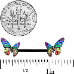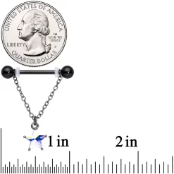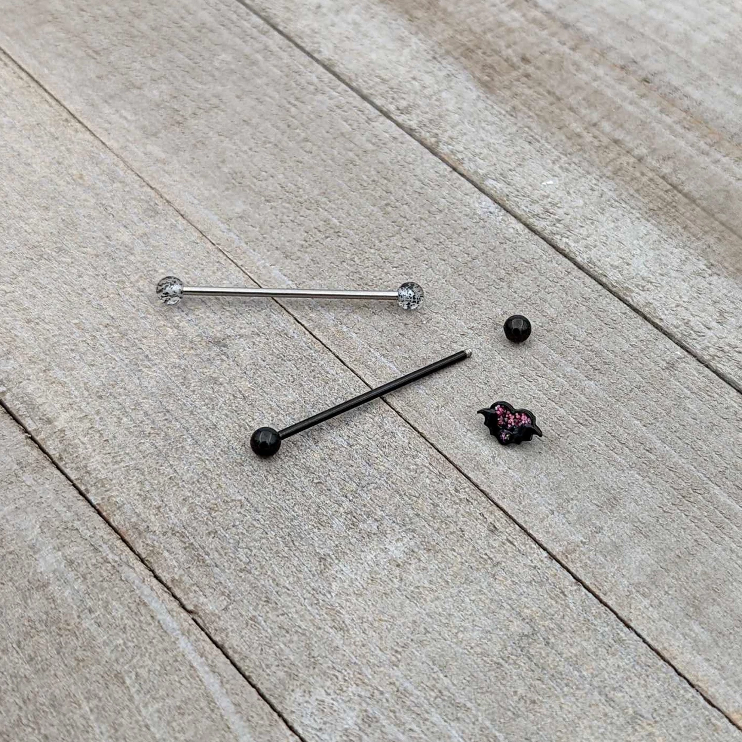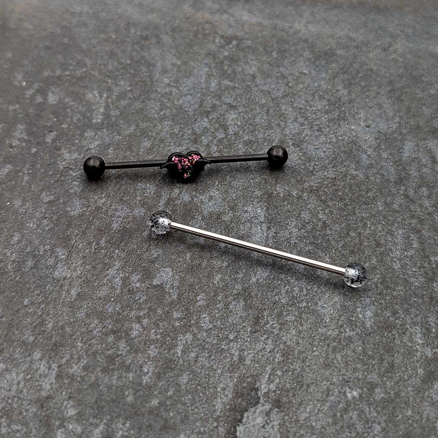 This Halloween, let a bat steal your heart with these 14 gauge helix barbells! One is made with a 1 1/2″ durable 316L surgical grade stainless steel straight barbell. It features 5mm clear acrylic ball ends, with glitter set inside for subtle style. The other is made with a 1 1/2″ black PVD over 316L surgical grade stainless steel straight barbell with 5mm ball ends. It features a floral heart charm, with a flying bat at the bottom. You can even slide the charm up and down the length of the barbell for the perfect look. These barbell earrings are sure to make your heart soar! Sold as a set of two.