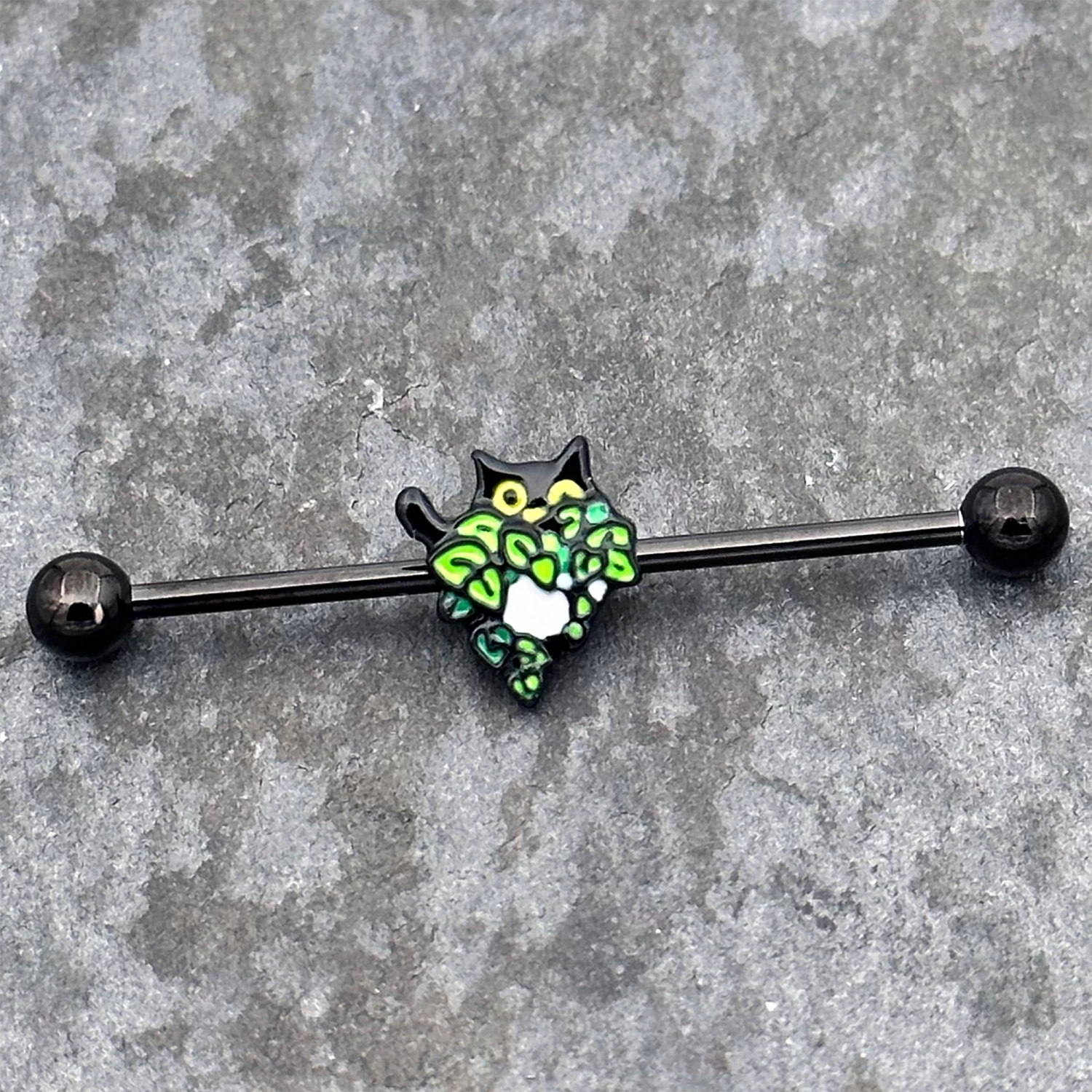 Get ready to pounce on style with this 14 gauge helix barbell. It is made with a 1 1/2 inch black PVD over 316L surgical grade stainless steel straight barbell with 5mm ball ends. It features a cat charm, with the cat hiding in green inlaid foliage for major contrast. You can even slide it up and down the length of the barbell for the perfect look. Get feline fabulous with the classic, kitty cat barbell earring.