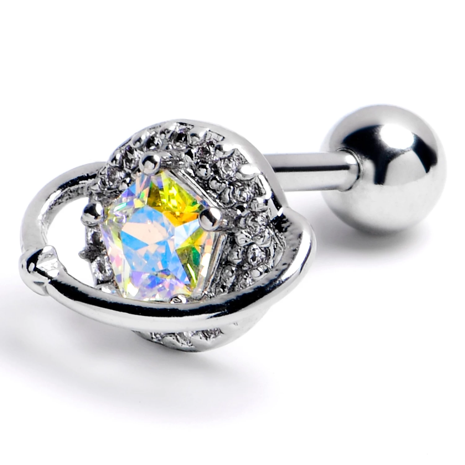 This 16 gauge tragus stud is out of this world. It is made with a 6mm durable 316L surgical grade stainless steel straight barbell with a 4mm ball end. It features the planet Saturn, with the planet composed of a single aurora cubic zirconia gem and ring. It is further embellished with textured detailing and you can rock it in multiple piercings including tragus, helix, and some conch piercings. This heavenly body is sure to make you see stars with this celestial-themed cartilage piercing jewelry.