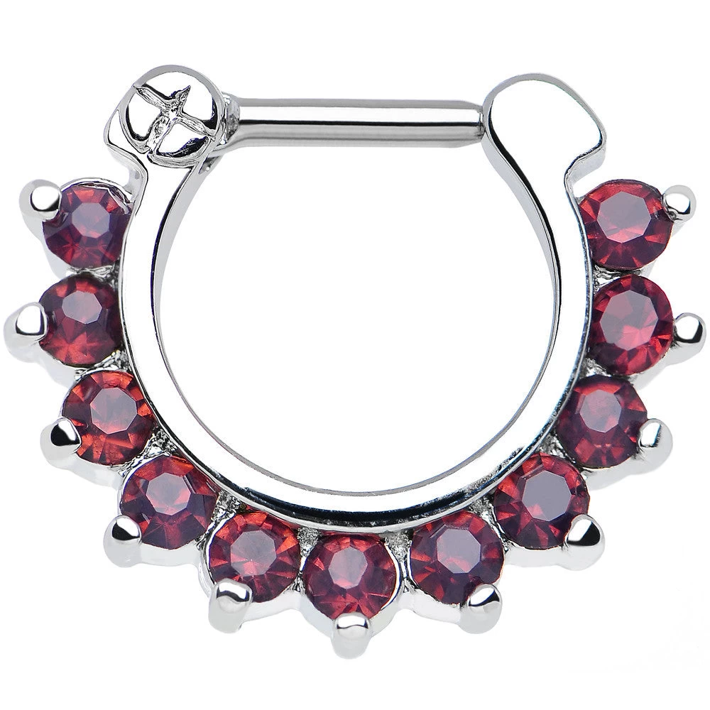 Change up your look with this brilliant septum clicker and its row of glimmering purple gems. This 16 gauge stainless steel septum clicker has a hinge that easily opens and clicks closed. Pierced septum Body Jewelry.