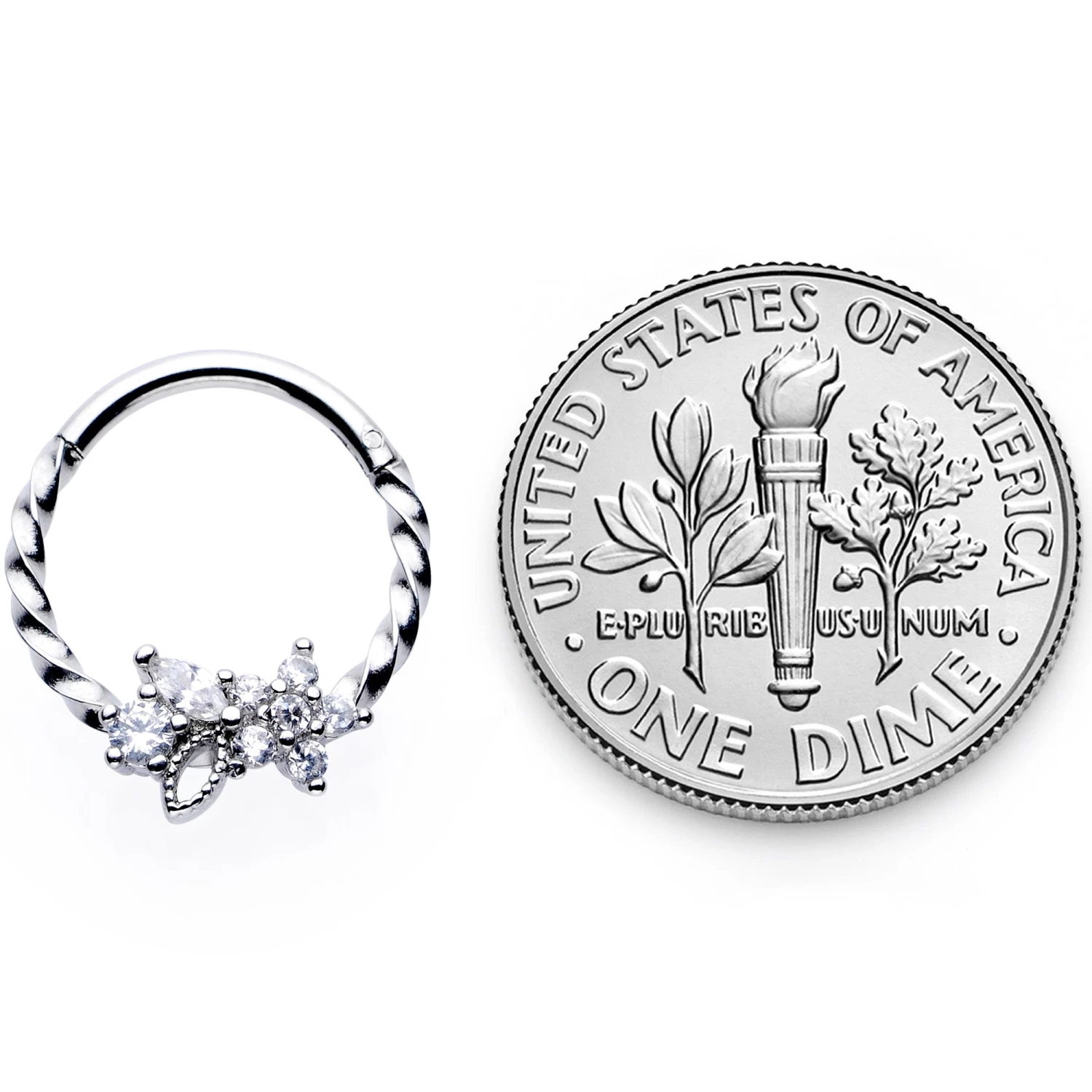 Put a new twist on your cartilage piercings with this 16 gauge segment ring! It’s made with a 10mm durable 316L surgical grade stainless steel hinged twisted circular ring. It features twisted sides and is crowned on the bottom with a cluster of clear gems. They form a small star, as well as adding geometric embellishments. This cartilage earring features a hinged, non-removable segment that makes it super easy to insert and remove. You’ll love that because it works so well in multiple piercings including septum piercings as well as cartilage piercings like the tragus, helix, daith, and more! That’s a twist you won’t regret!