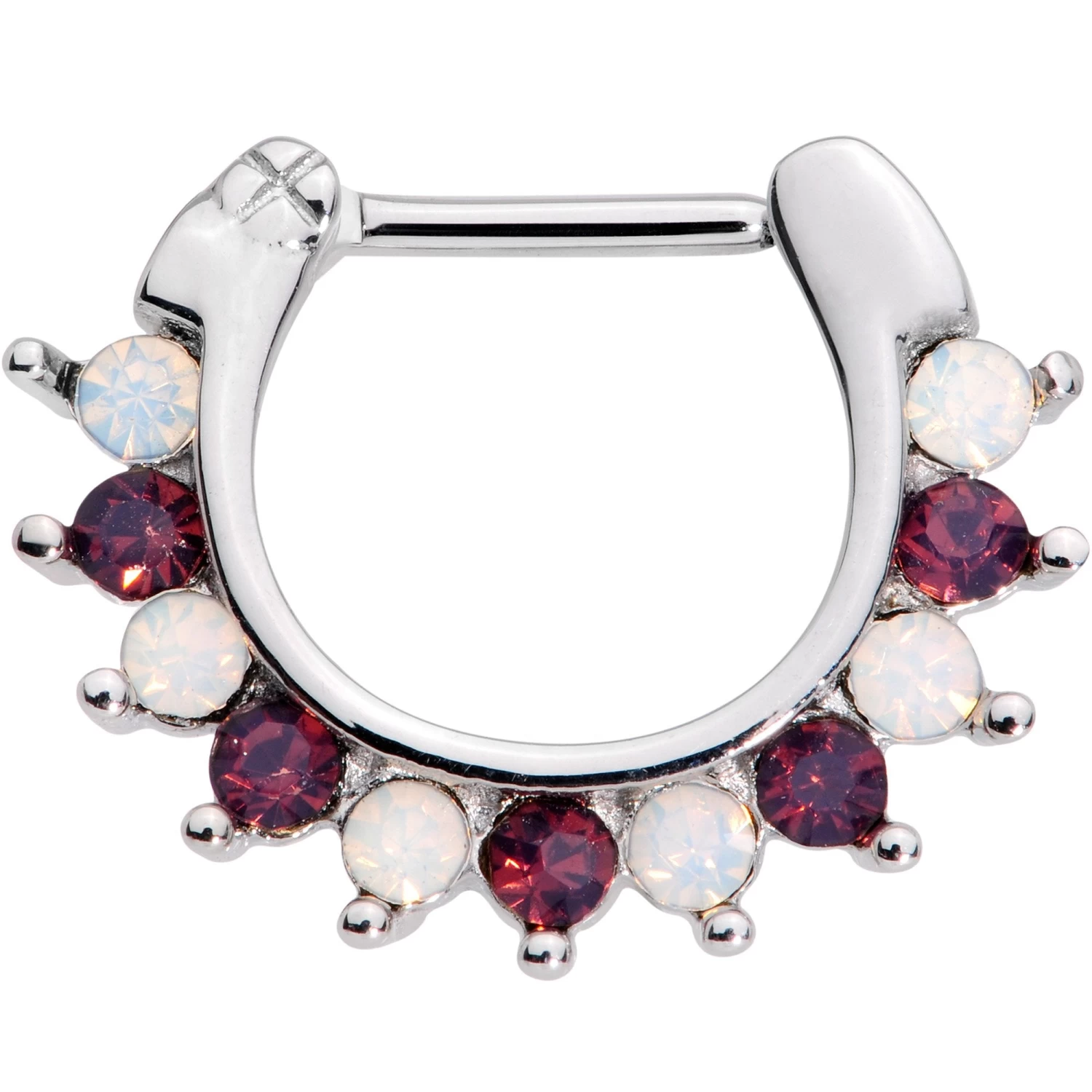 Change up your look with this brilliant septum clicker and its row of glimmering red and white gems. This 16 gauge septum clicker features alternating prong set deep red and white gems. The septum jewlery features a 5/16″ in length hinged barbell made with durable 316L surgical grade stainless steel.