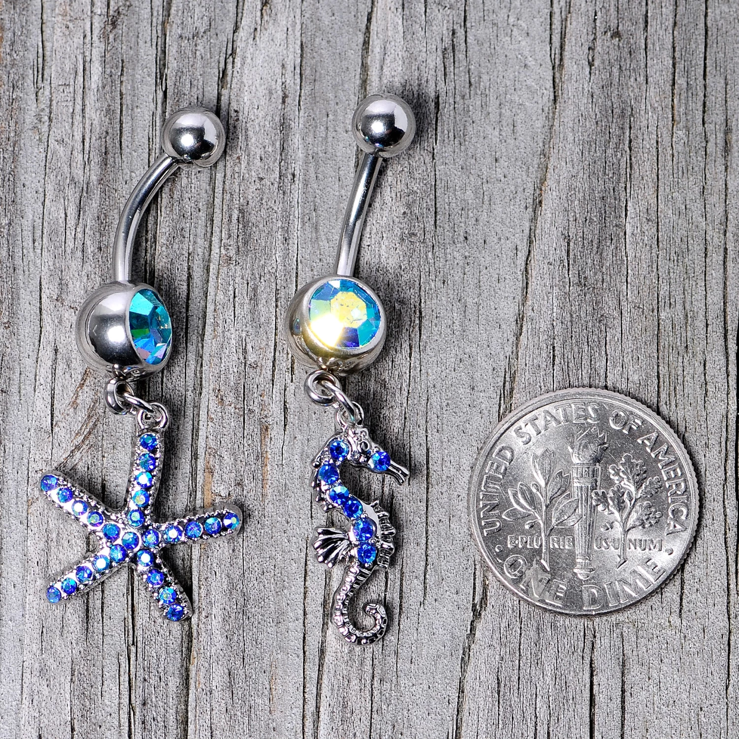 Blue Gem Starfish Seahorse Nautical Dangle Belly Ring Set of 2