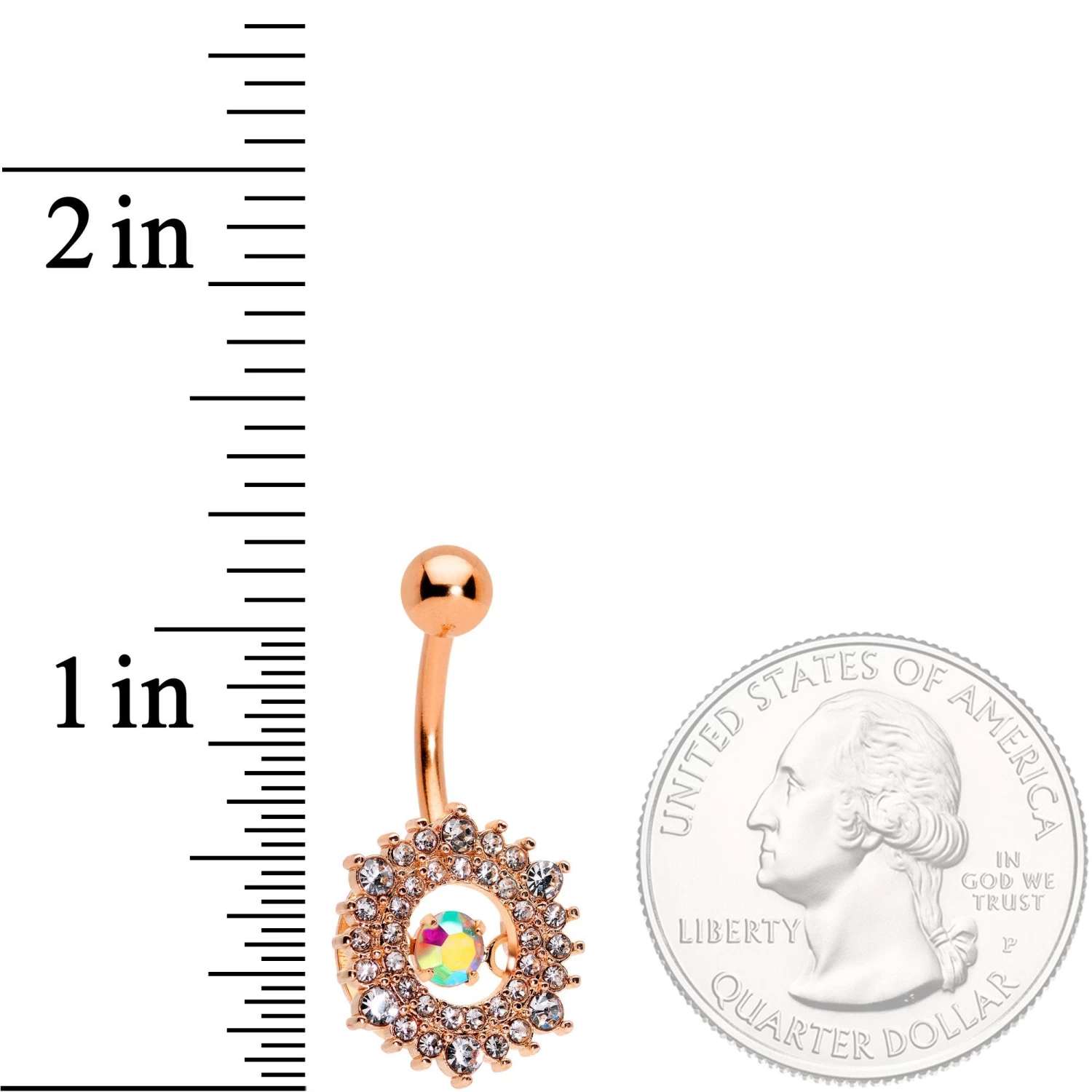 This 14 gauge belly button ring resembles the rays of the sun and just like the sun….it moves! Made with a 7/16″ rose gold tone plated over 316L surgical grade stainless steel curved barbell, it has a 5mm top ball end. The bottom is a sunburst shape composed entirely of clear gems. The center of the sunburst is open and dangling in the middle is a tiny aurora gem. It’s suspended in such a way that allows it freedom of movement, guaranteed to catch the light as well as catching the eye of anyone who sees it. And you can enjoy its beauty any time of day…or night!