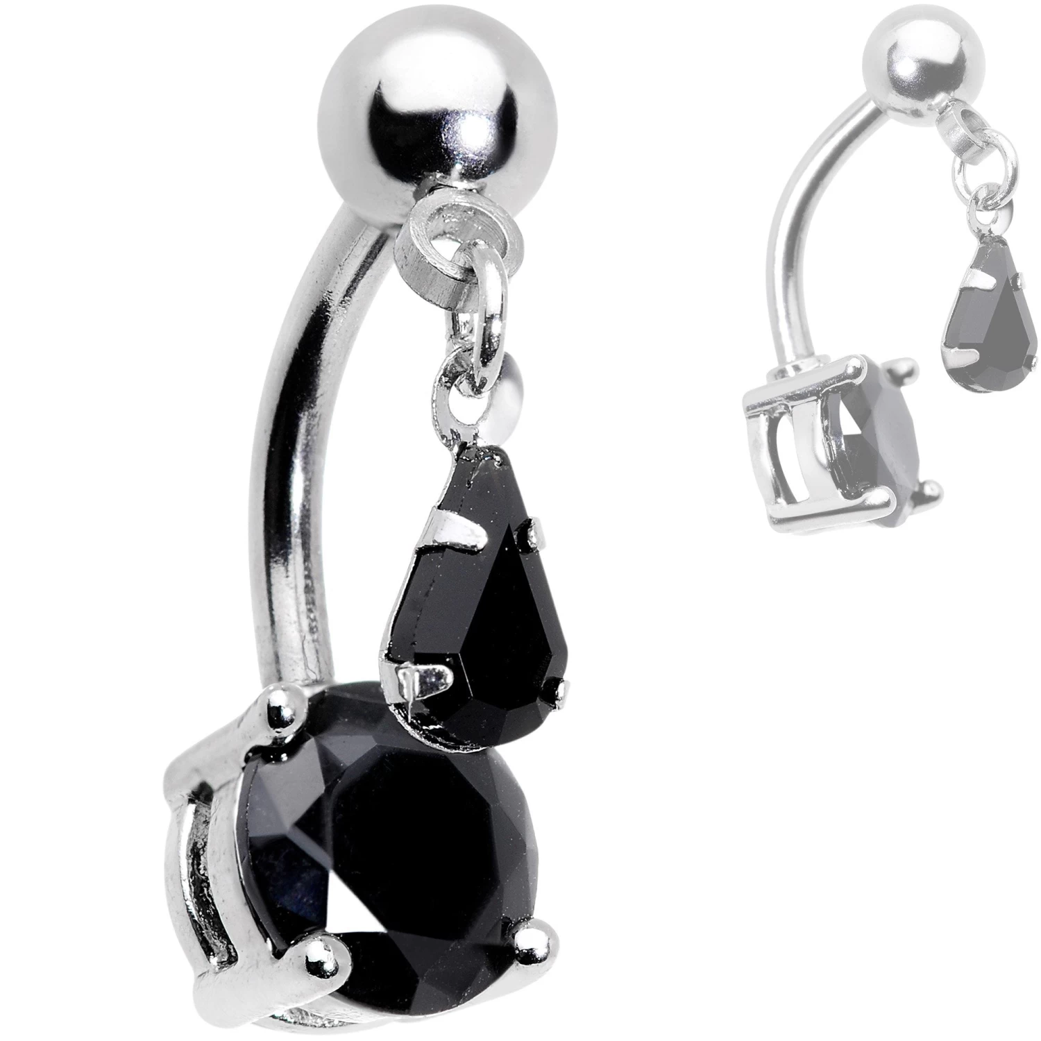 If you love options, then this pack of three belly button piercings is a perfect find. Each of these unique 14 gauge belly button piercings features a double mount dangle design with a top mount dangle charm. On the bottom end of each navel ring is a large cubic zirconia gem in clear, black, or purple; on the top end is a matching dangle gem. Each navel piercing features a curved barbell made with an 11mm length durable 316L surgical grade stainless steel. Sold as a set of 3.