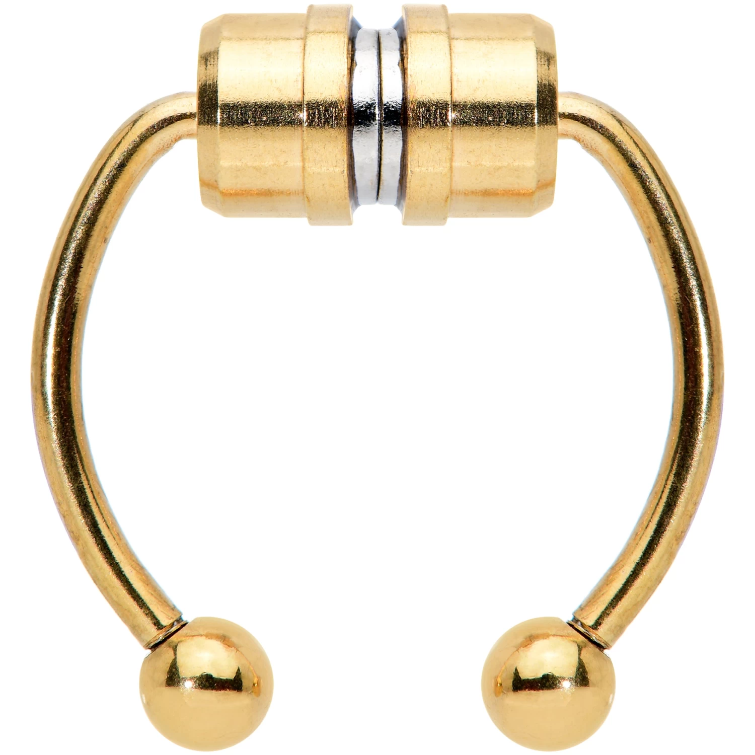 If you like the look but aren’t ready to commit yet, this faux septum jewelry is perfect for you! It features a pair of magnets to hold it securely in place without the need of a trip to the piercer. It has a gold tone electroplated finish that gives you a classic look that stands the test of time. Try out a new look before you commit with this magnetic faux septum jewelry!