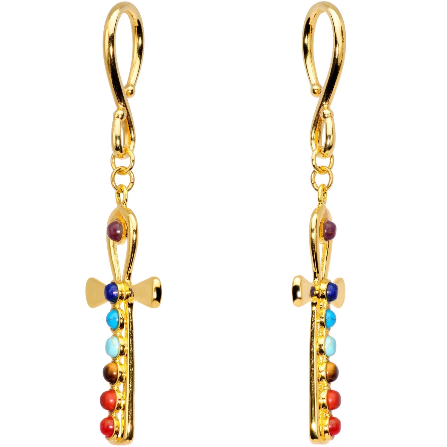Embrace your inner balance while getting in touch with your outer beauty when you wear this pair of handcrafted dangle tunnel plug earrings. Made with gold plated over pewter hook backings, these stretched ear hangers require an 8 gauge minimum size, can be worn alone or with tunnel plugs, and feature Egyptian ankh dangle charms set with color accents that align with the chakras. With a total length of 89mm and a weight of .63oz, these ear weights are handmade in the USA and are sold as a set of two for you.