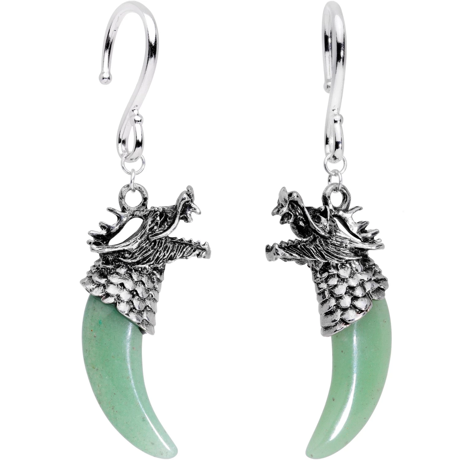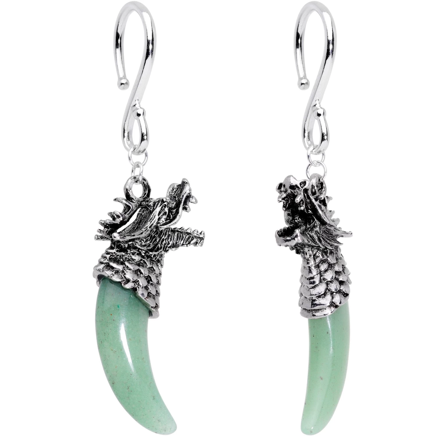 Feel your natural dragon energy when you wear these dragon-inspired ear weights. These 1.49oz ear weights for stretched ears have an 8 gauge minimum size requirement and have a 3.2″ total length. Featuring beautiful metalwork dragon’s head mountings, these fearsome ear weights are decorated by a pair of tooth-shaped chunks of green agate stone. Wear them on their own in your stretched lobes or combine with tunnels for a wide variety of style choices. Sold as a set of two. Handmade in the USA.