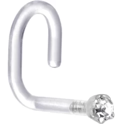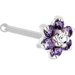 Solid 14KT White Gold Amethyst And Clear Cubic Zirconia Flower Nose Ring