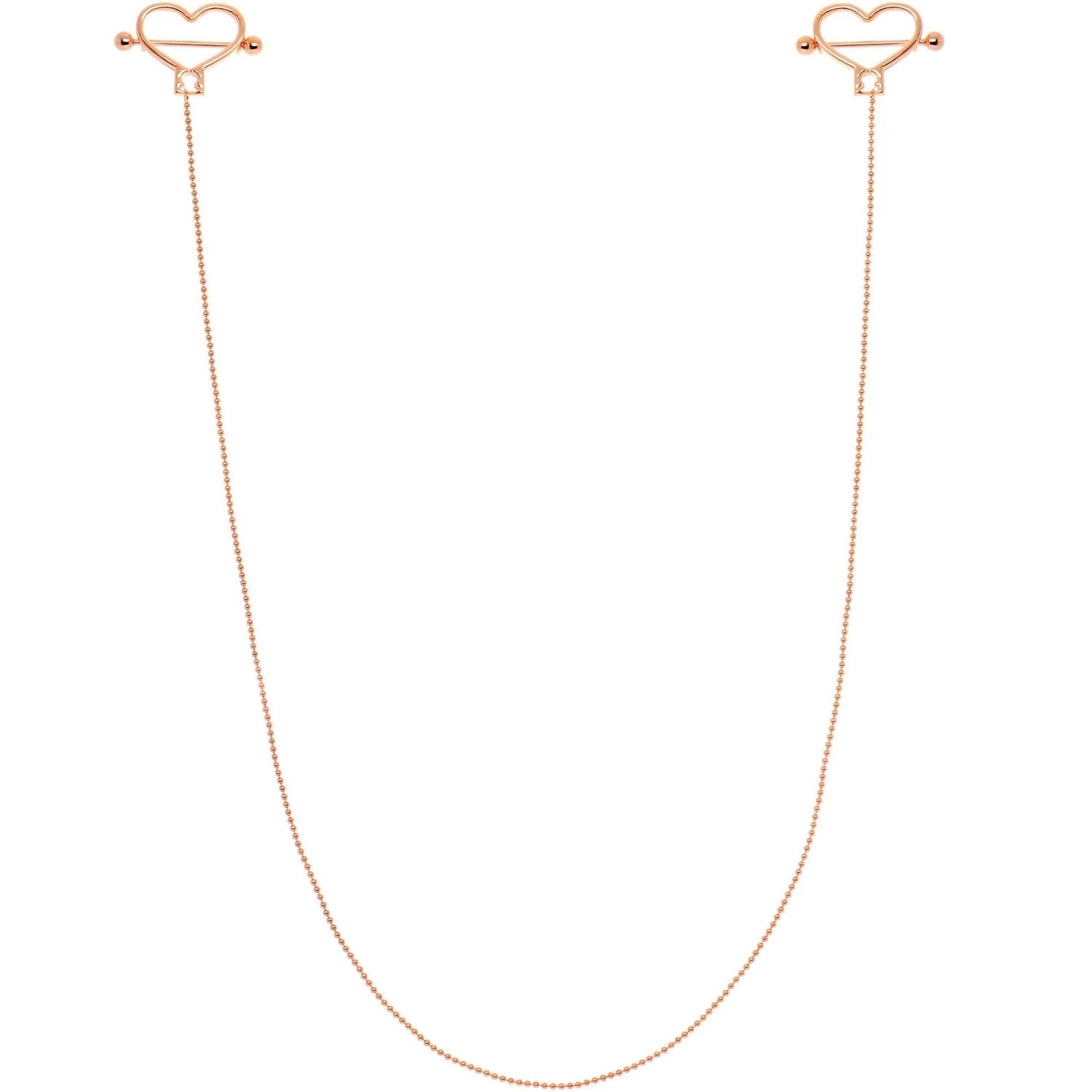 It’s like a necklace for your breasts! This unique 14 gauge nipple chain jewelry is the perfect piercing to add to your body jewelry collection. This nipple ring chain features a pair of rose gold tone heart shaped nipple shields connected by a bead chain. With 1″ straight barbells made from rose gold tone anodized over 316L surgical grade stainless steel, this 19″ length nipple chain will really give you something to show off this Valentine’s Day.