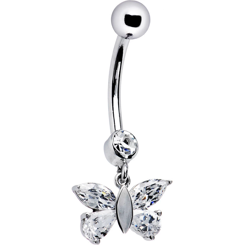 Beautifully bold cubic zirconia butterfly belly ring. Solid gold belly ring featuring a dangle butterfly. High polish 14 karat gold Body Jewelry./P>