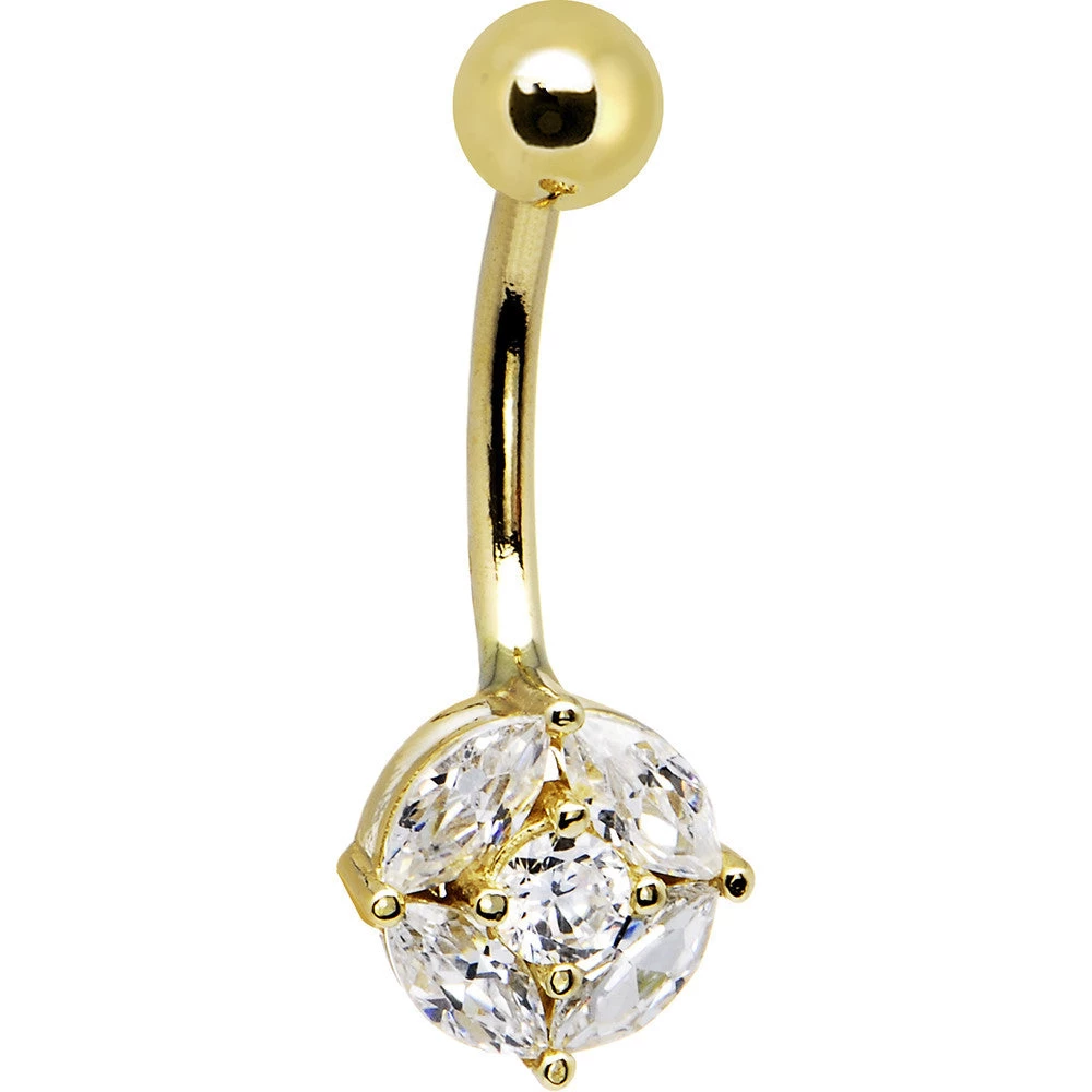 Regal radiance is a guarantee with this solid gold belly ring. Gold cubic zirconia belly ring. High polish 14 karat gold Body Jewelry. Real solid gold belly ring with dazzling cubic zirconia gemstones for women.