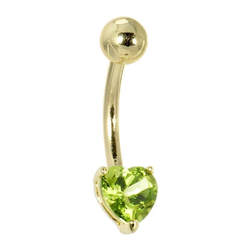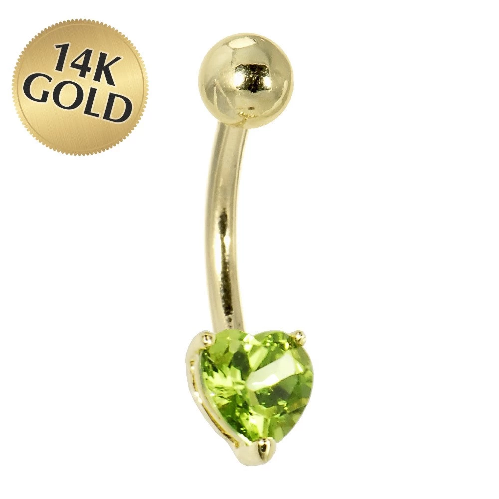 Precious Stone Heart Belly Ring. 14KT Solid Gold Belly Ring. Genuine Peridot Belly Ring. A perfect heart shaped August birthstone belly ring for any occasion. Add Body Candy body piercing jewelry at wholesale prices to your collection today!