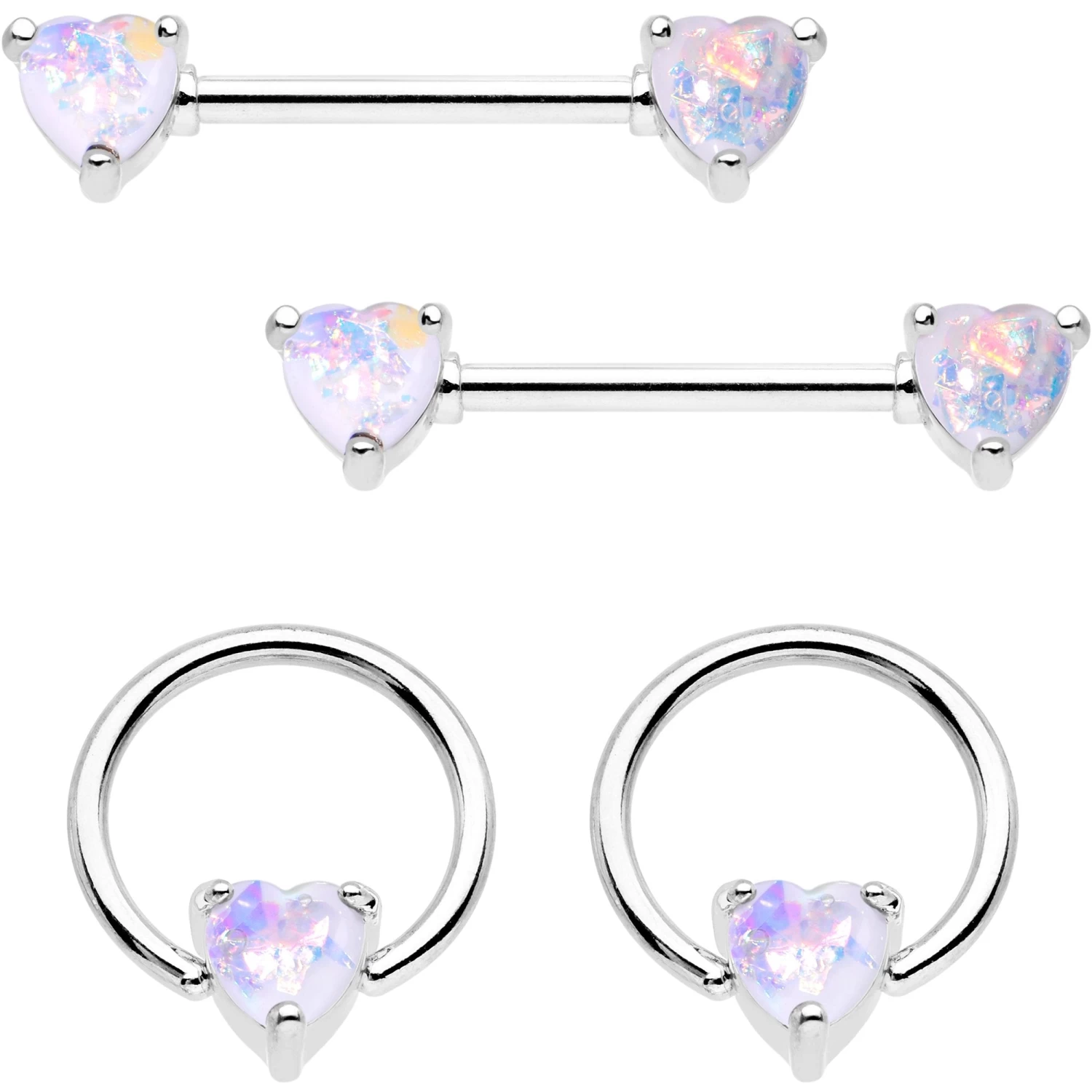 White Faux Opal Heart Captive Ring Straight Barbell Nipple Ring Set